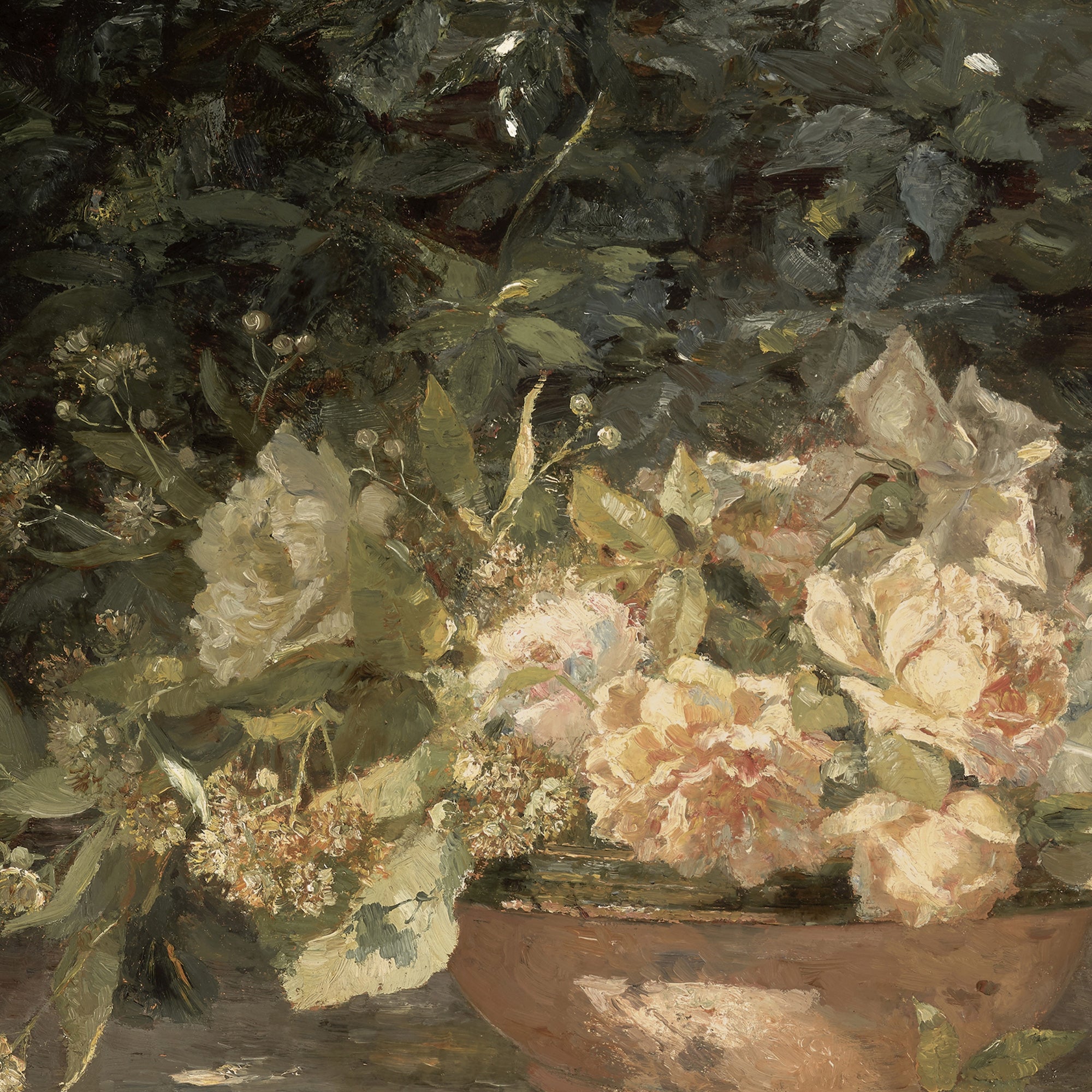 This antique botanical art piece shows a soft floral arrangement in a bowl on a wooden table surrounded by leafy greens. The warm tones and gold frame give it a classic, vintage look that fits well in a living room, dining room, or entryway. This framed floral still life adds gentle beauty and natural detail to your home decor.