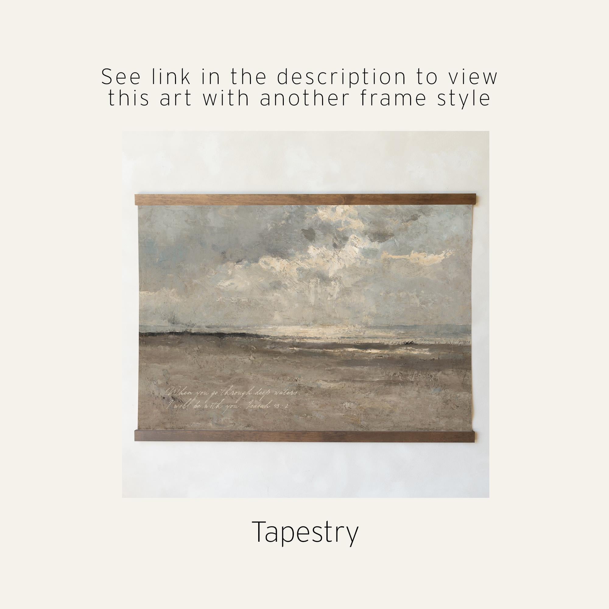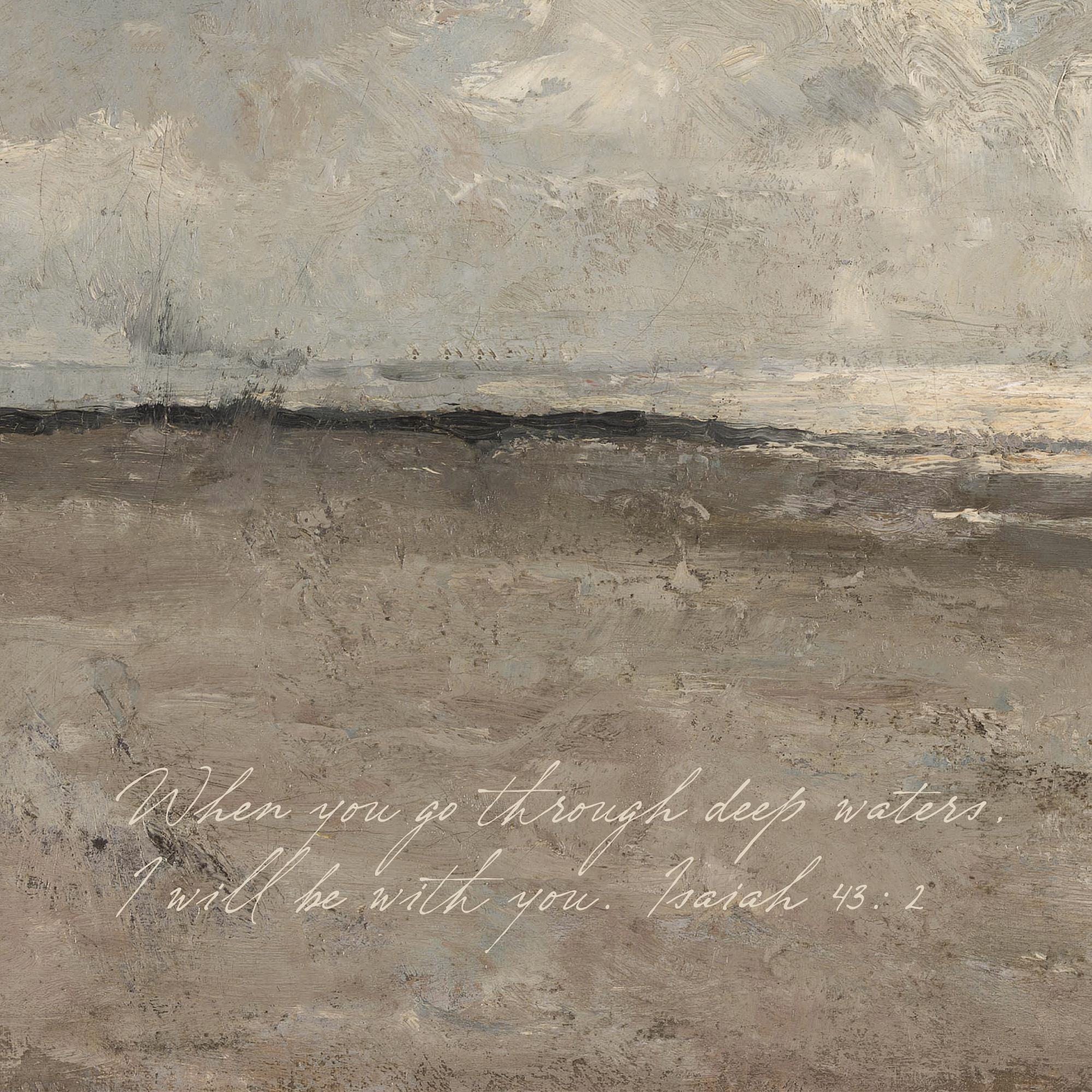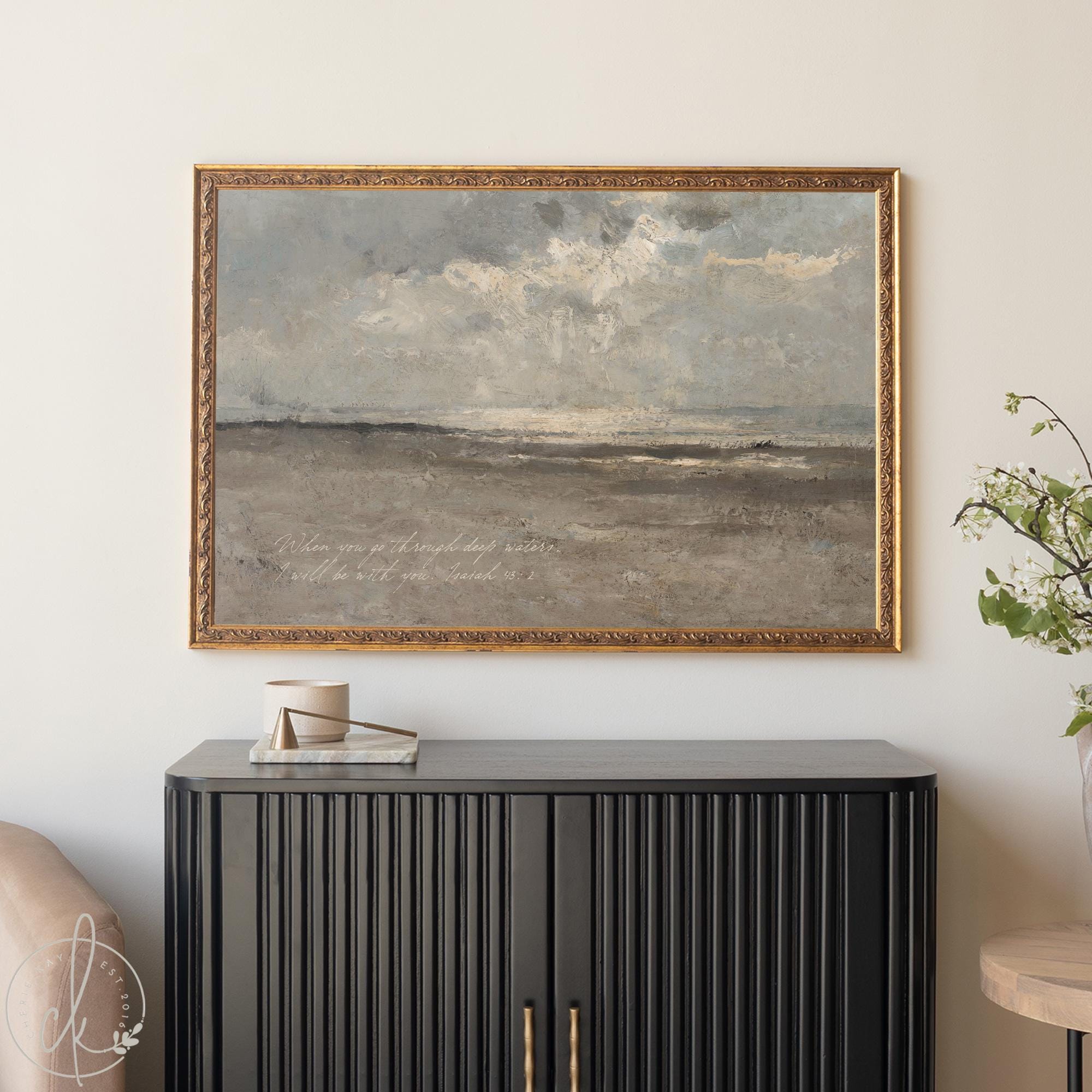 This Bible verse wall art shows a calm coastal scene with soft gray and sand tones. The verse reads, “When you go through deep waters, I will be with you.” — Isaiah 43:2. The framed ocean painting brings a peaceful touch to any room and fits beautifully with Christian home decor, neutral wall decor, or coastal wall art styles. Perfect for a living room, entryway, or bedroom, it also makes a meaningful Christian gift for someone who loves Scripture art.