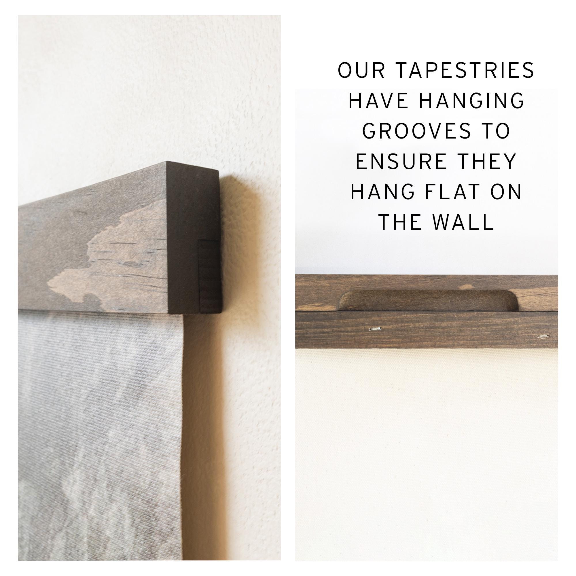The frame is wooden. The hanging grooves on the back ensure the tapestry hangs flat on the wall.