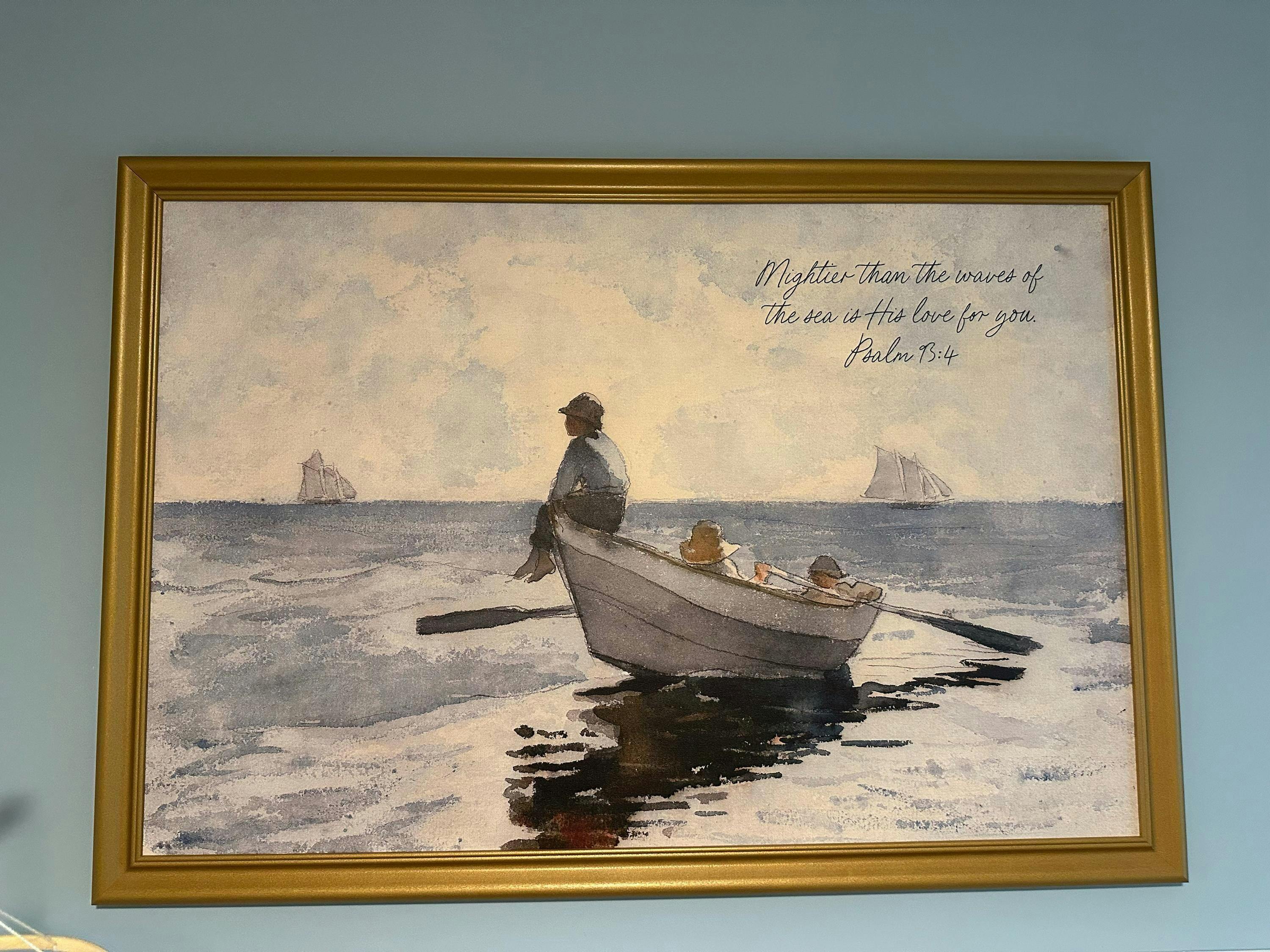 This beautifully framed coastal painting features a serene ocean scene and the inspiring Bible verse, "Mightier than the waves of the sea is His love for you" from Psalm 93:4. Perfect for adding a calming, faith-filled touch to a nursery, kids' room, or beach house, this ocean-themed art print brings together the beauty of nature and the power of Scripture. The neutral tones and natural wood frame make it a timeless piece that easily blends with any decor. Ideal for Christian homes seeking peaceful, coastal-inspired wall decor.