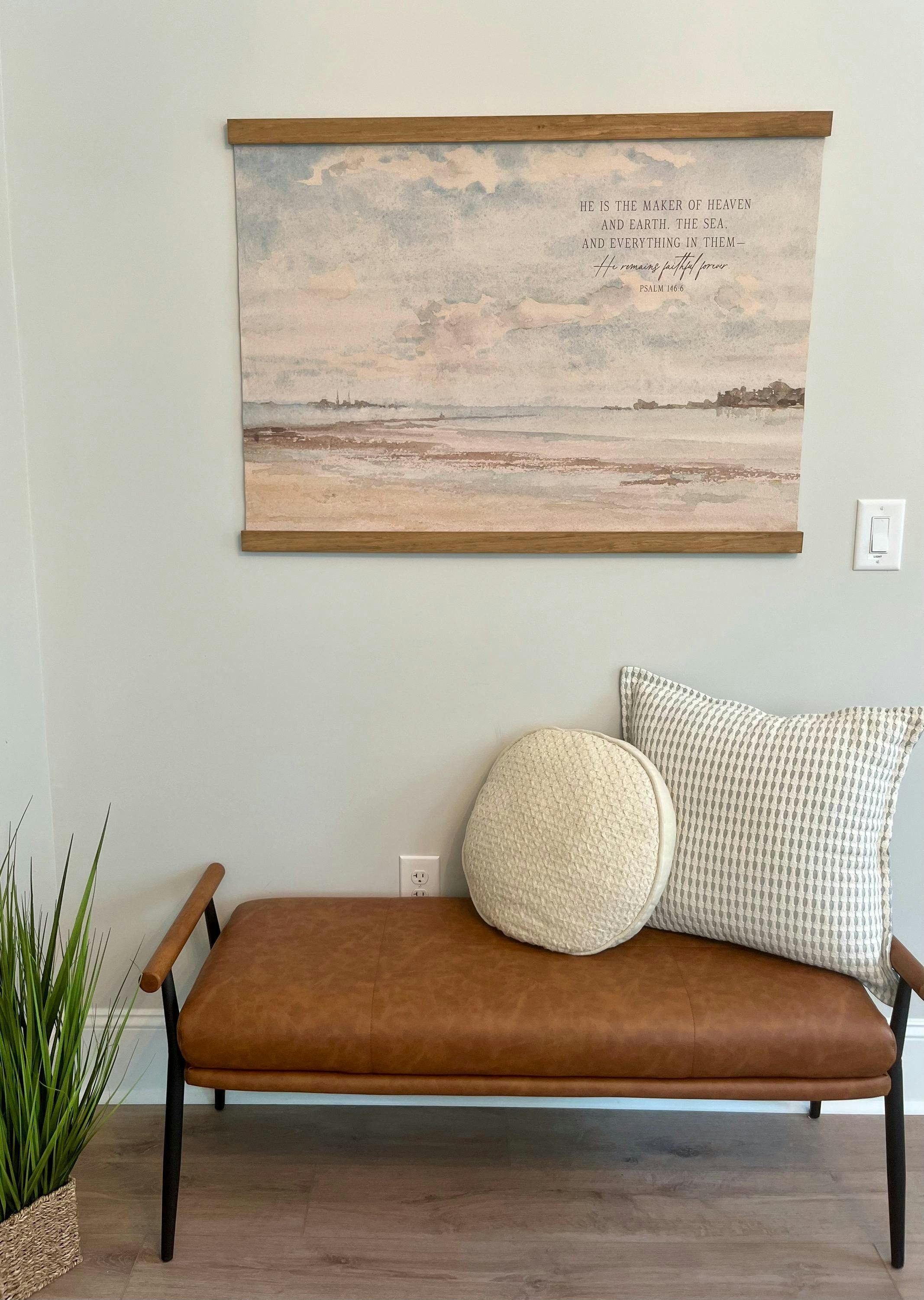 Beach wall art meets faith in this large coastal canvas tapestry; a watercolor beach painting with optional Psalm 146:6 verse, ready to hang for a beautiful focal point.
