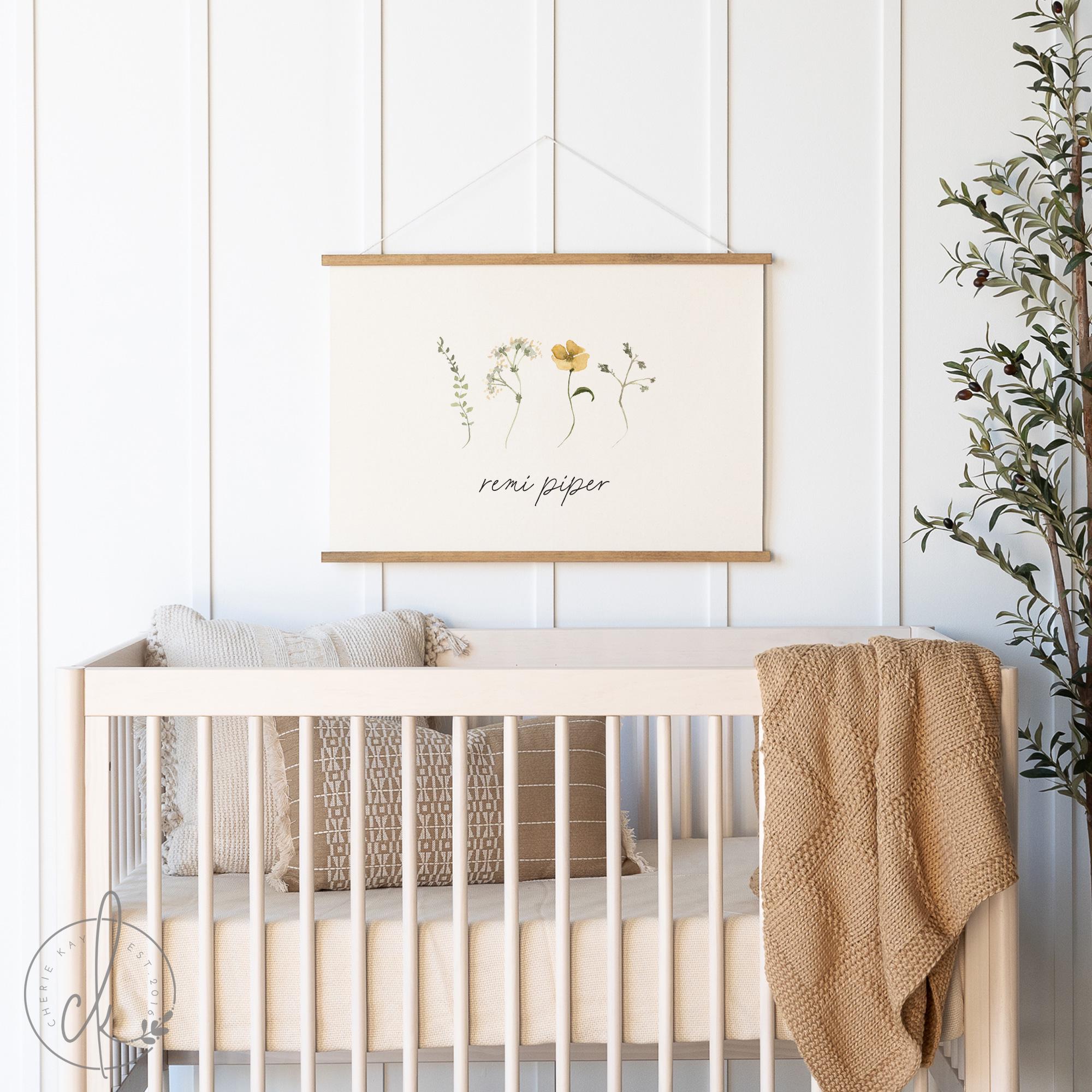 This floral nursery decor features soft botanical illustrations and your baby’s name in elegant script—creating a personalized focal point above the crib. Each piece is designed as personalized name wall art with delicate flowers, neutral tones, and a wooden hanging frame. Perfect as baby girl wall art, a custom baby gift, or nursery wall hanging that celebrates your child’s name in style.