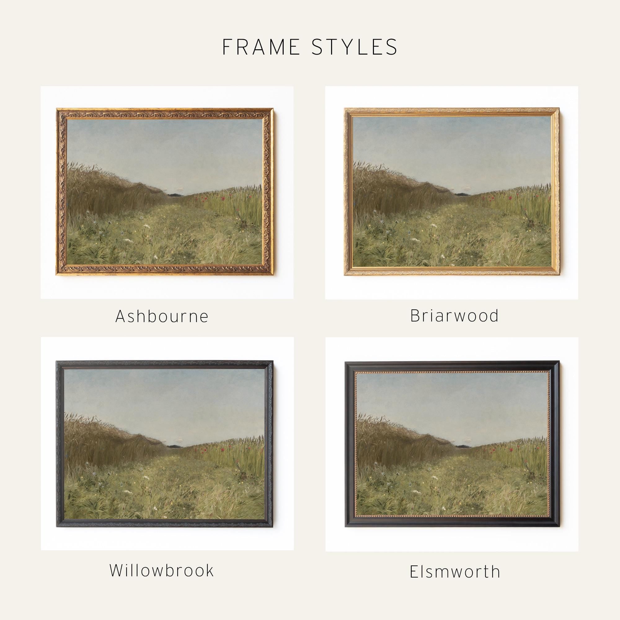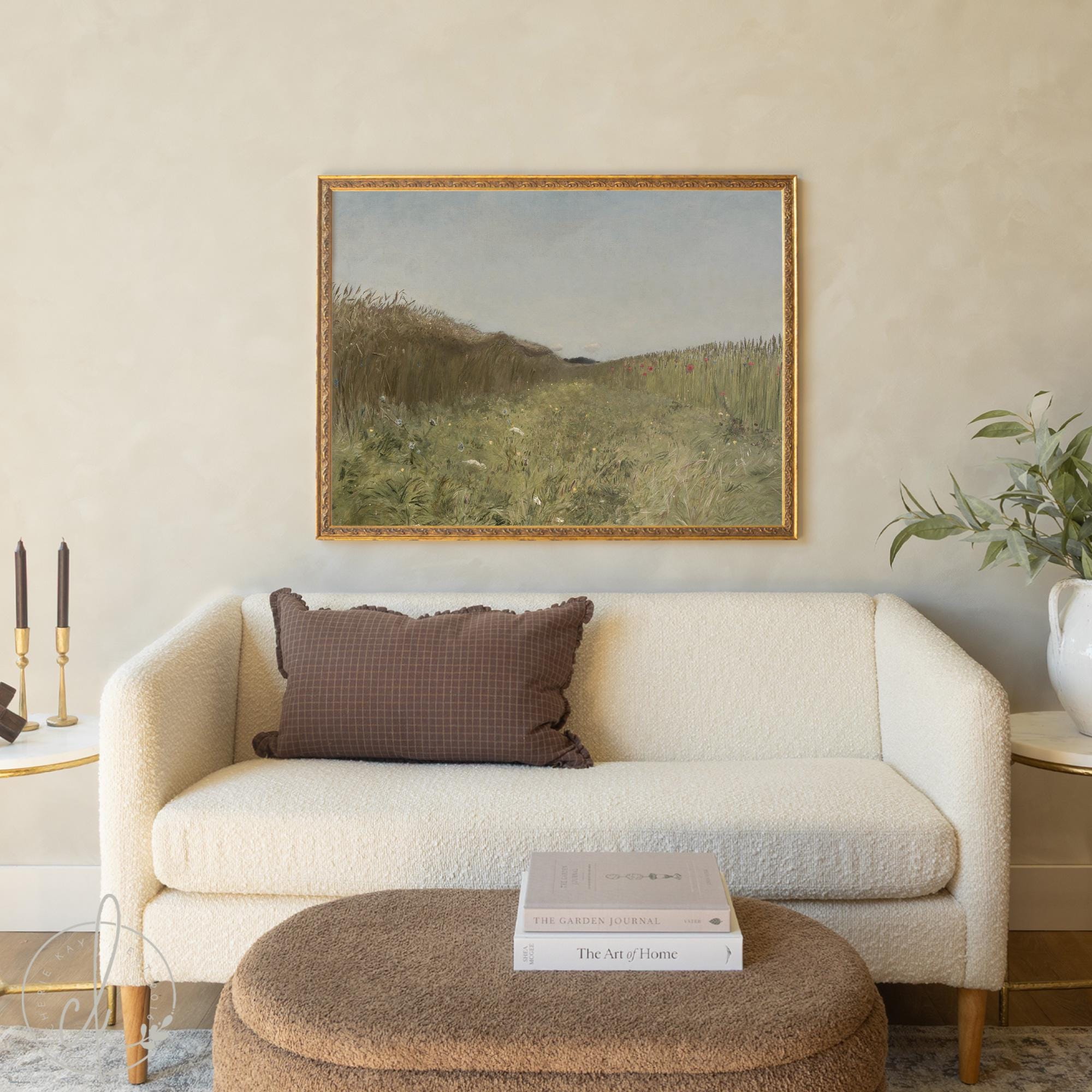 This framed landscape art features a quiet countryside meadow with tall grass, wildflowers and soft skies. The scene feels open and peaceful, making it a great way to bring the outdoors inside your home. The gold frame adds a classic touch that fits beautifully in living rooms, bedrooms, or entryways. Perfect for anyone who loves nature landscape paintings, large wall art, or beautiful countryside decor.