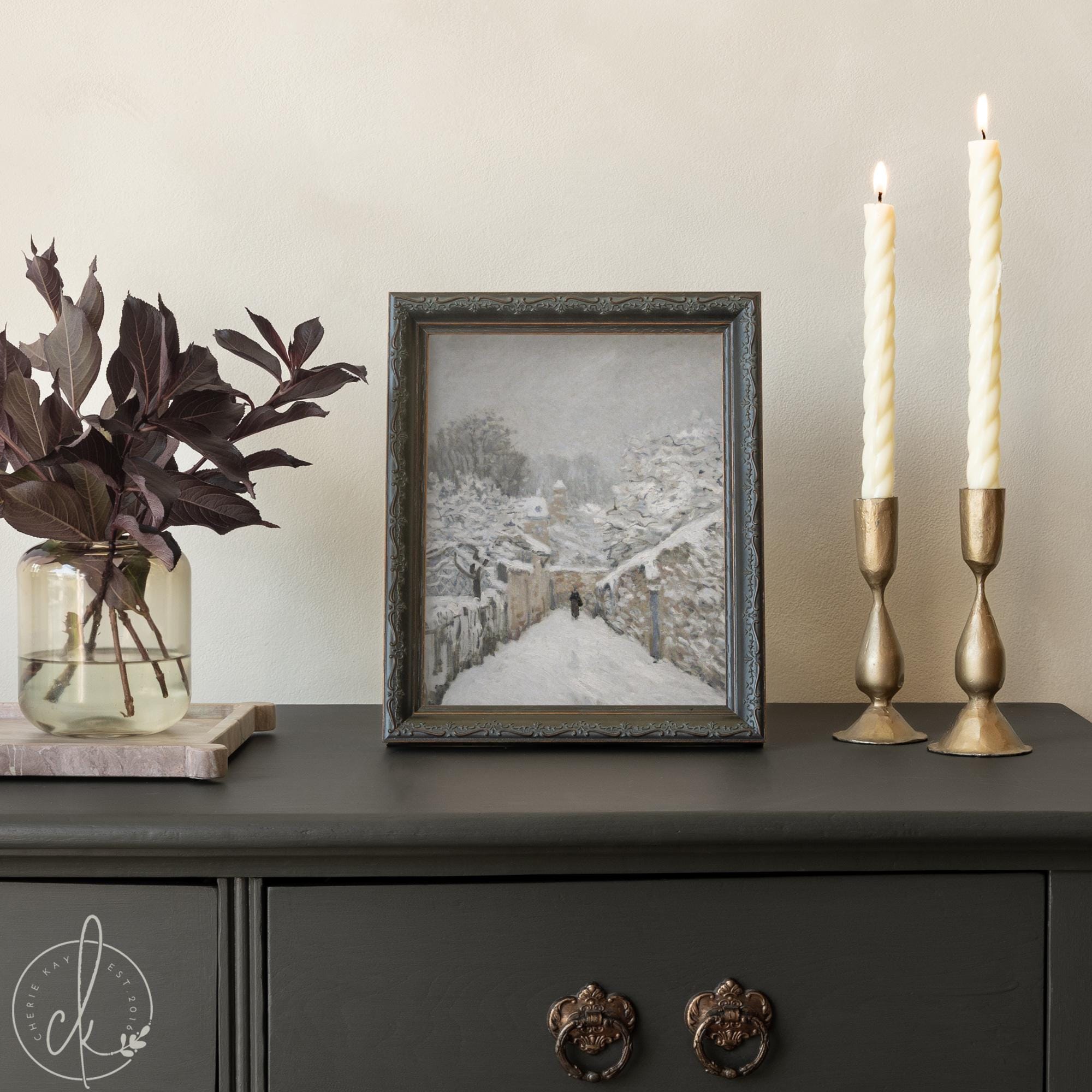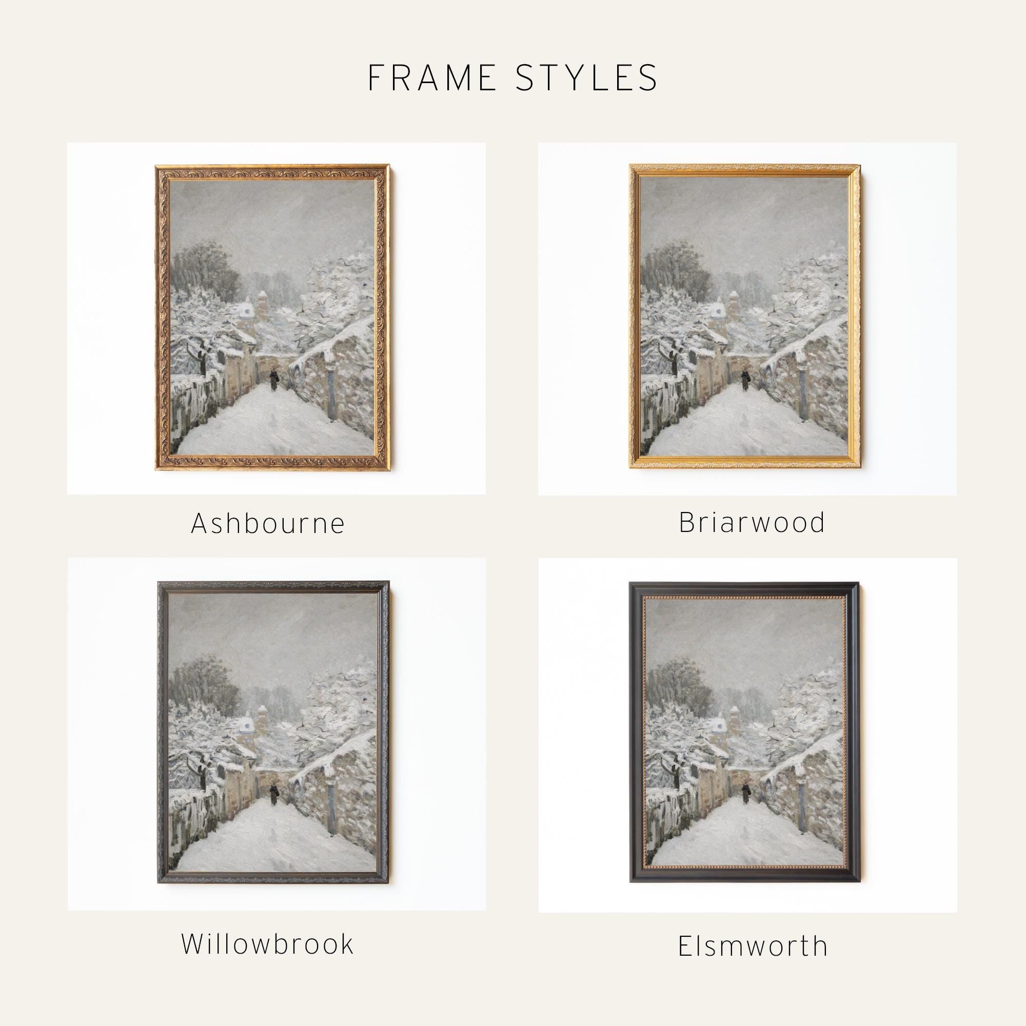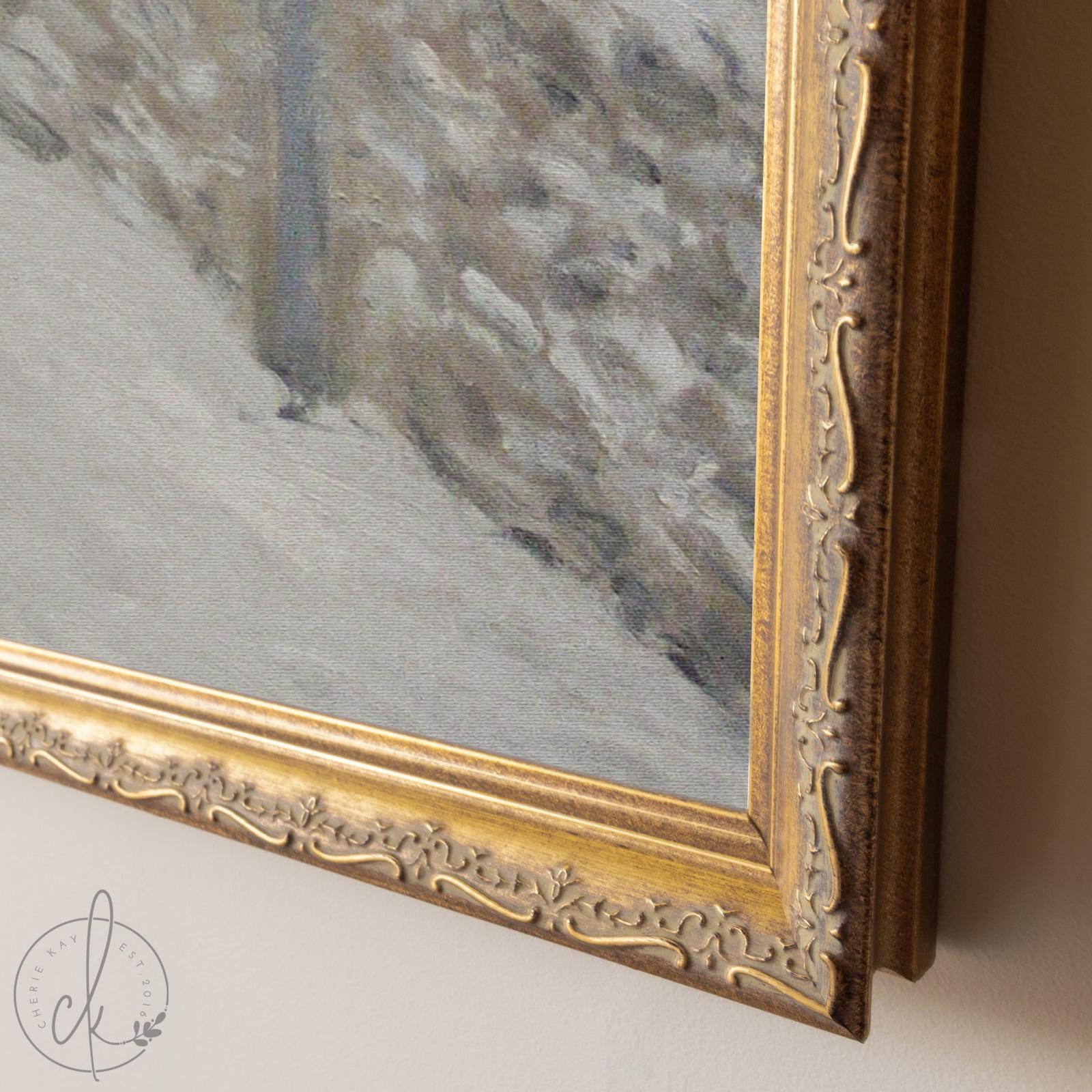 This winter village painting is a framed fine art reproduction of “Snow at Louveciennes” by Alfred Sisley, depicting a quiet snow-covered street lined with stone walls and trees. The soft brushwork and muted palette create a gentle, atmospheric impressionist landscape that brings warmth and texture to your living room, entryway, or study. Ideal for anyone who appreciates neutral wall art and classic landscape scenes, this framed piece adds a calm seasonal accent that complements both modern and traditional interiors.