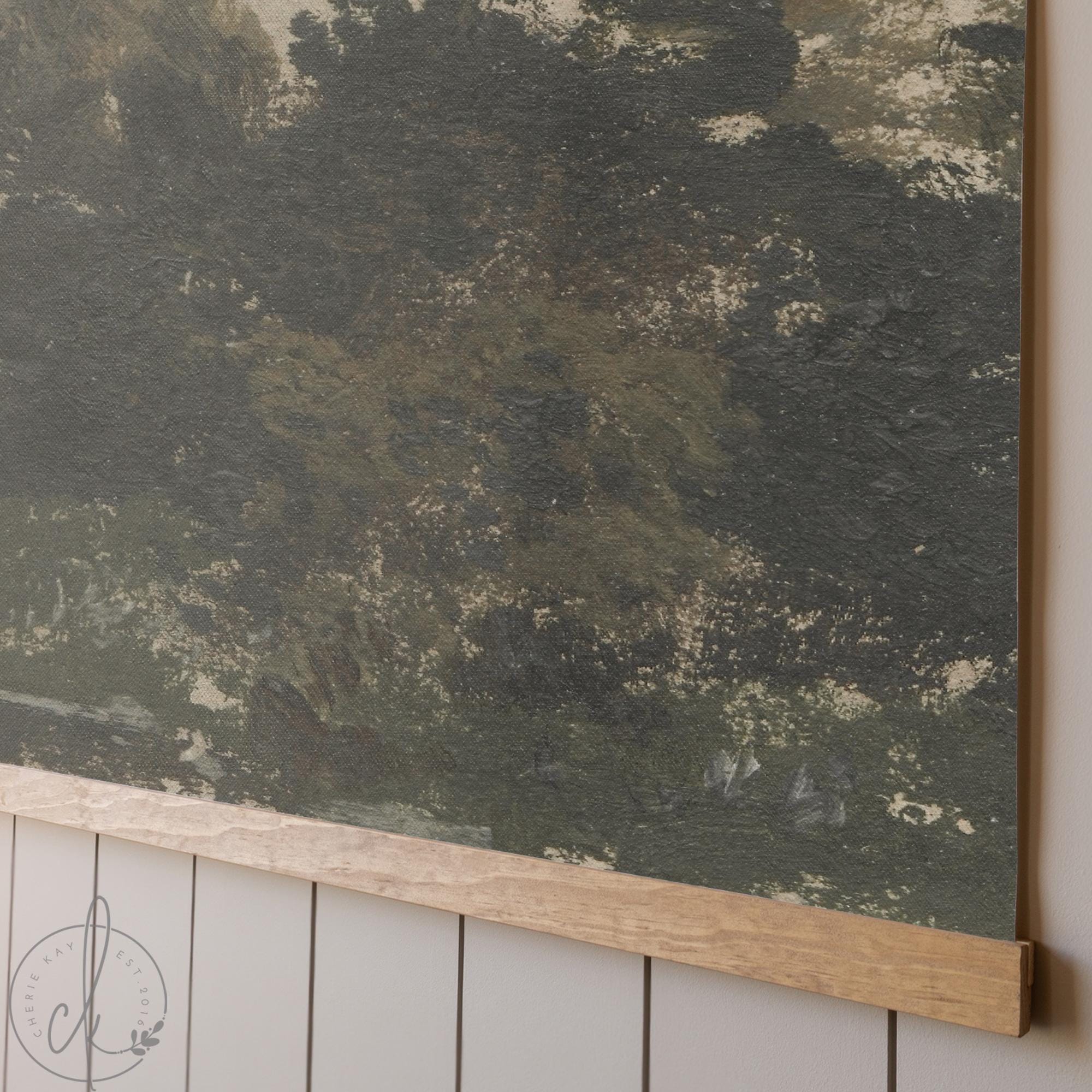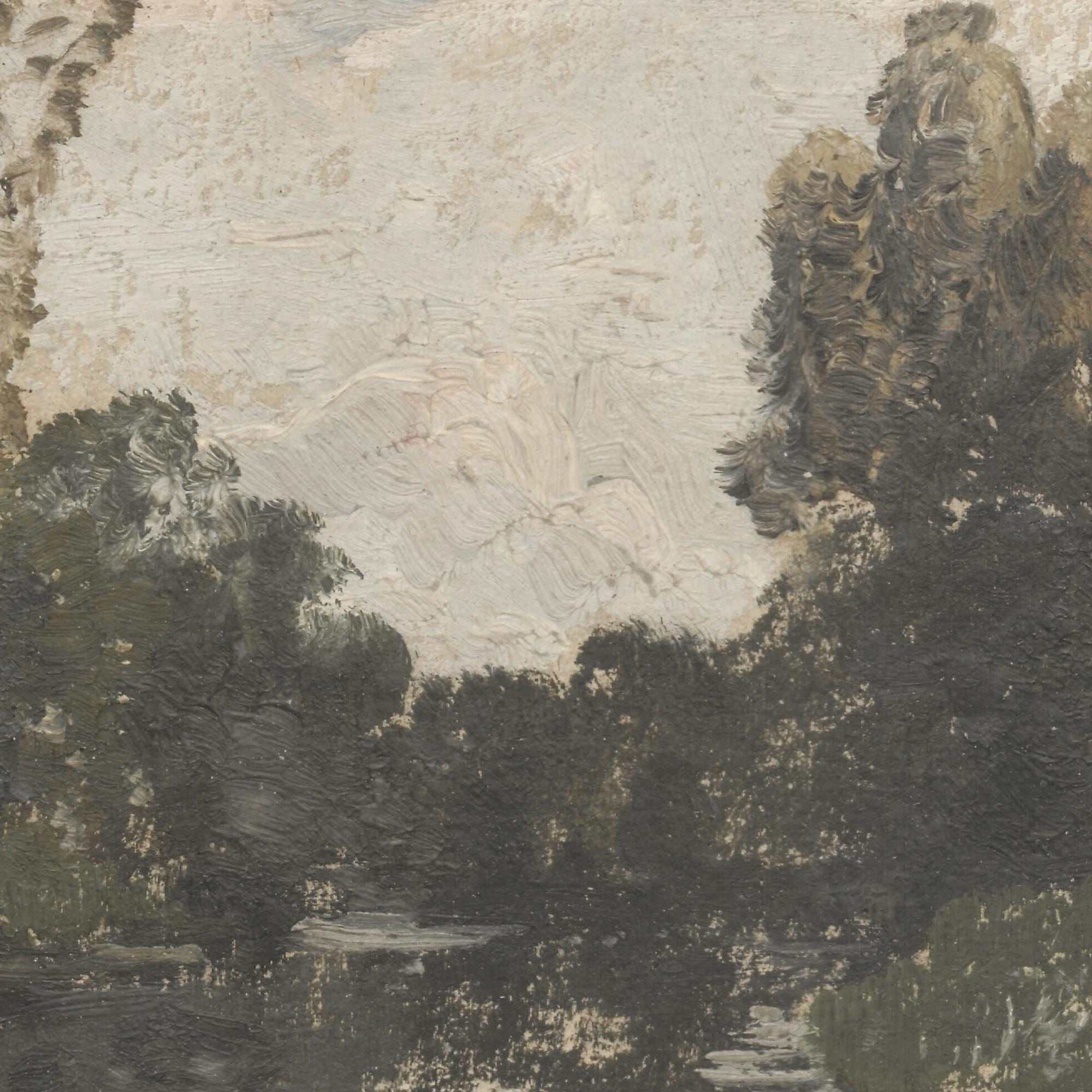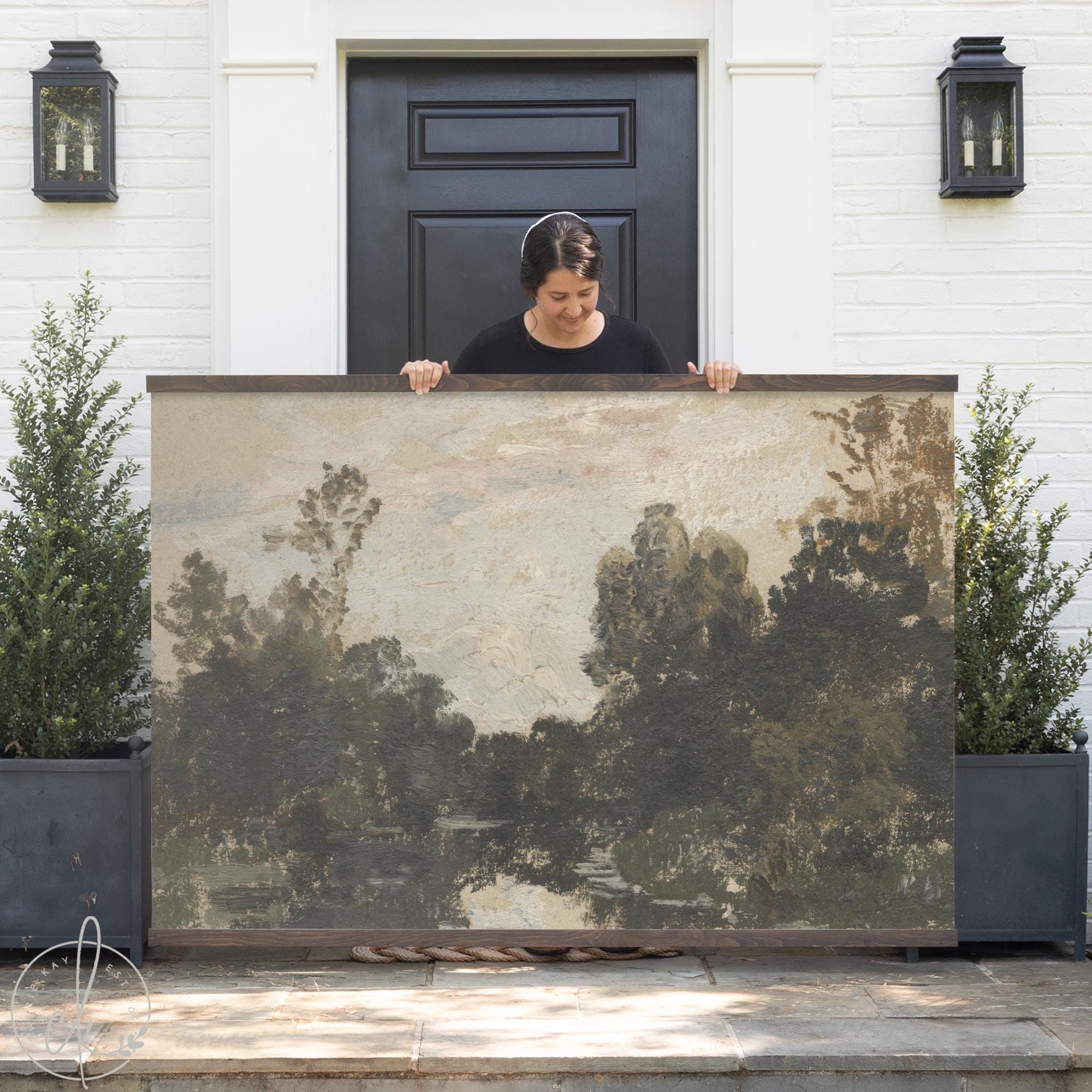 This impressionist landscape art features a moody river scene framed by dark trees against a soft, hazy sky — all printed on canvas and hung from a natural wood frame for an oversized vintage look. The muted olive greens and warm earth tones make it a natural fit for living rooms, bedrooms, or dining rooms, and it's especially great above a couch where you need one big piece to fill the wall.