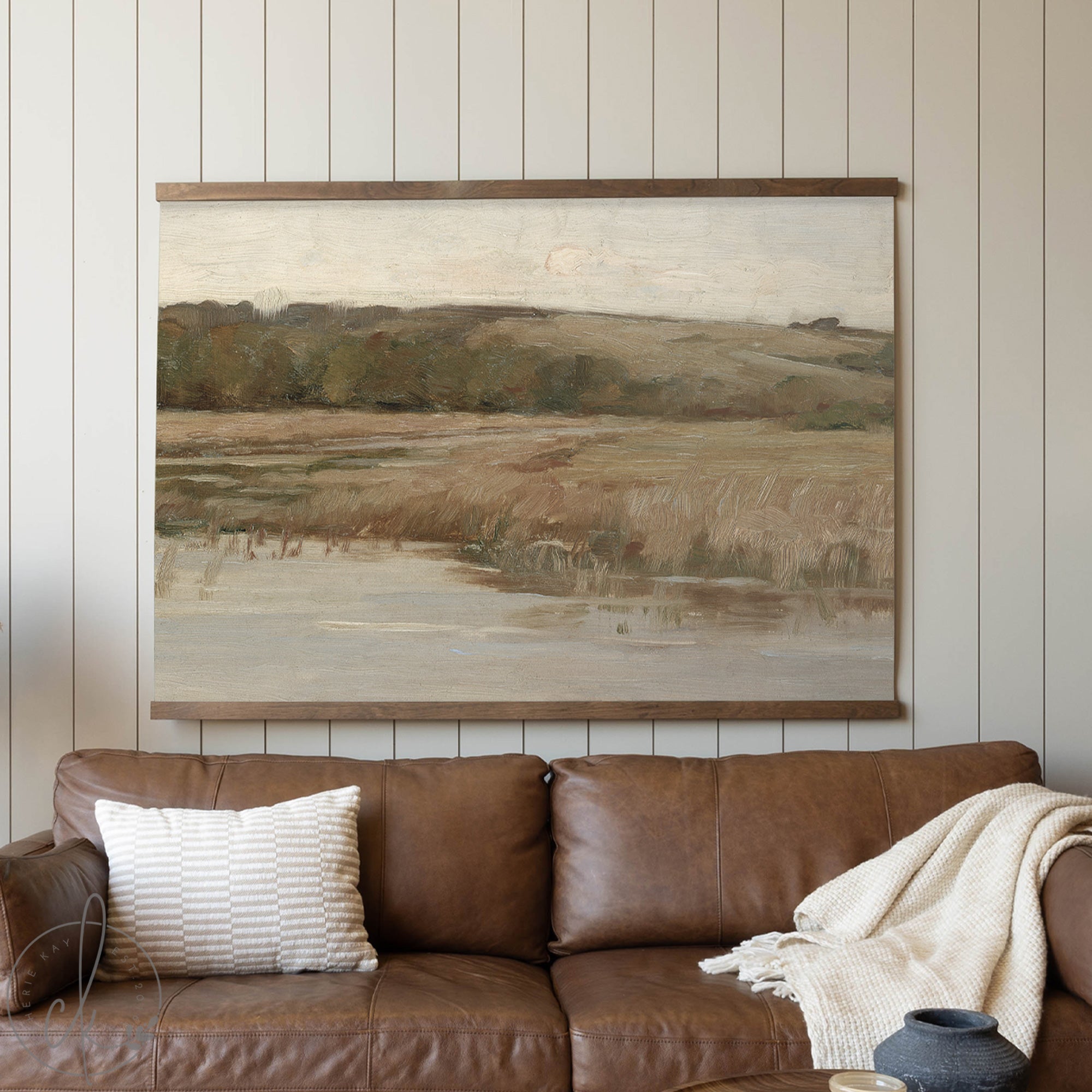 Transform your space with this large landscape canvas tapestry, featuring a serene meadow and river scene printed on premium cotton canvas. The soft brushstrokes and muted earth tones create a peaceful, timeless look that blends seamlessly with modern, minimalist, and classic interiors. The flowing water in the foreground adds depth and movement, drawing the eye into the rolling fields and distant hills under a soft, hazy sky. Whether displayed in a living room, bedroom, or office, this nature-inspired artwork brings warmth and tranquility to your walls, making it the perfect statement piece for any space.