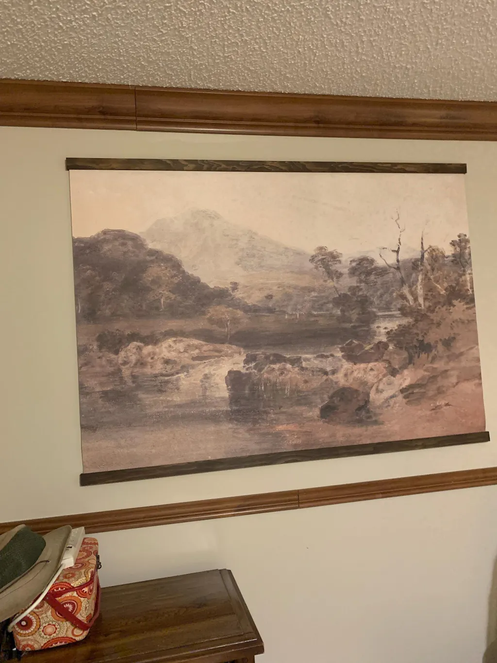 I’ve online shopped for wall decor for my family room for a long time. When I came across this piece something about the colors caught my eye and I couldn’t get this piece out of my head. I feel like that kind of abstract, vintage landscape is something I won’t soon tire of looking at. This piece ties together many of the neutral colors of my home, but also ties in some of the greens I use and gives some great contrast to my light color walls. The price was great for artwork at that size and quality is beautiful as well. I will probably replace with a different framed canvas tapestry from Cherie Kay whenever I’m ready for something new.