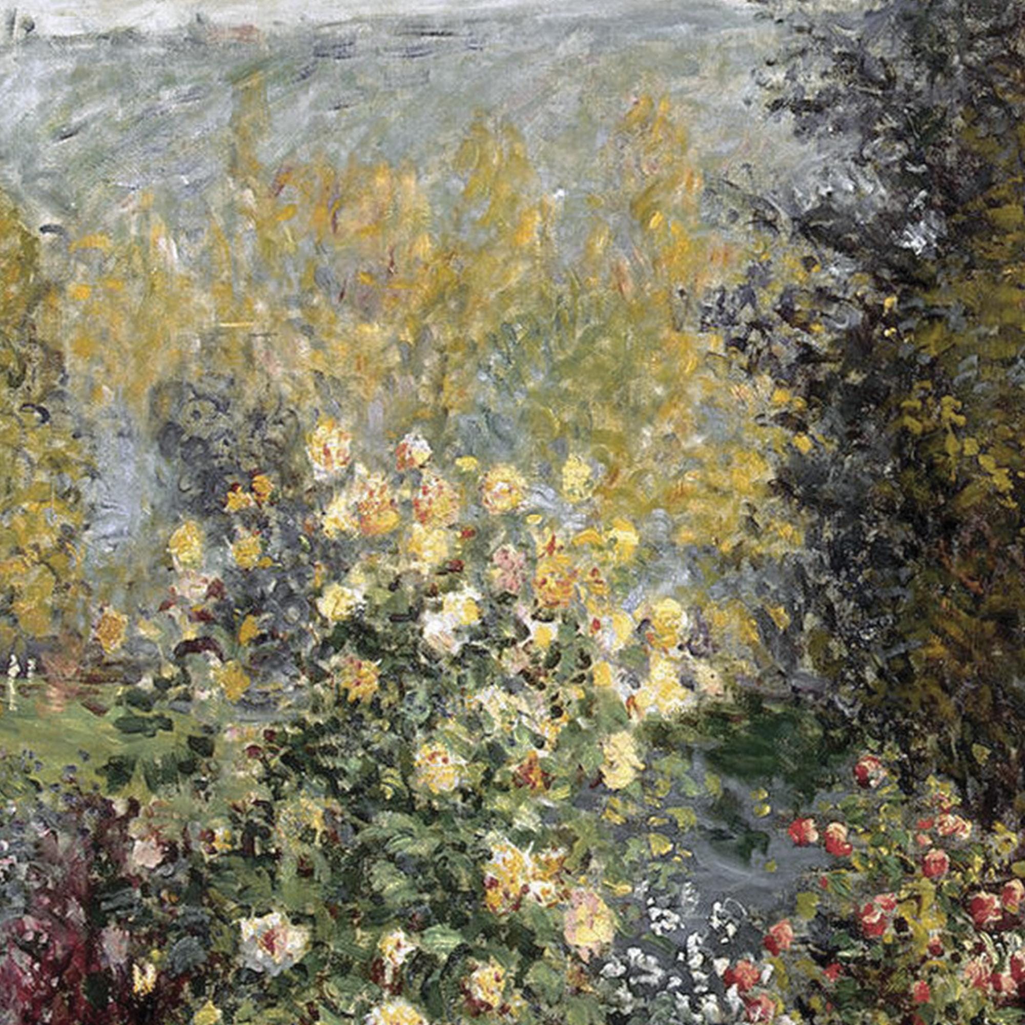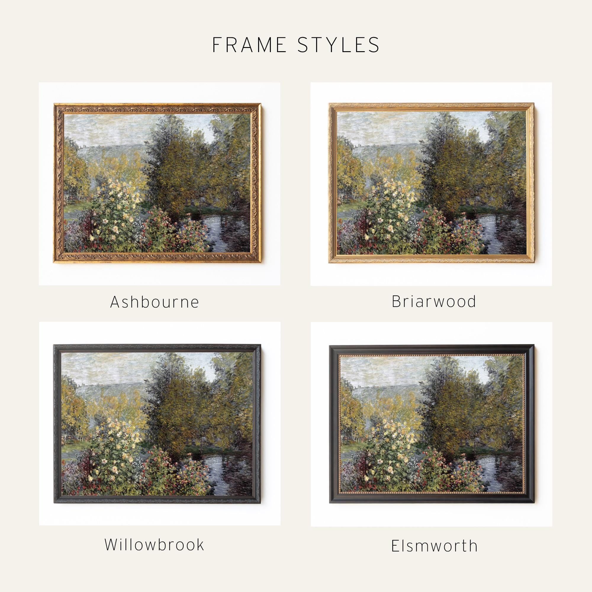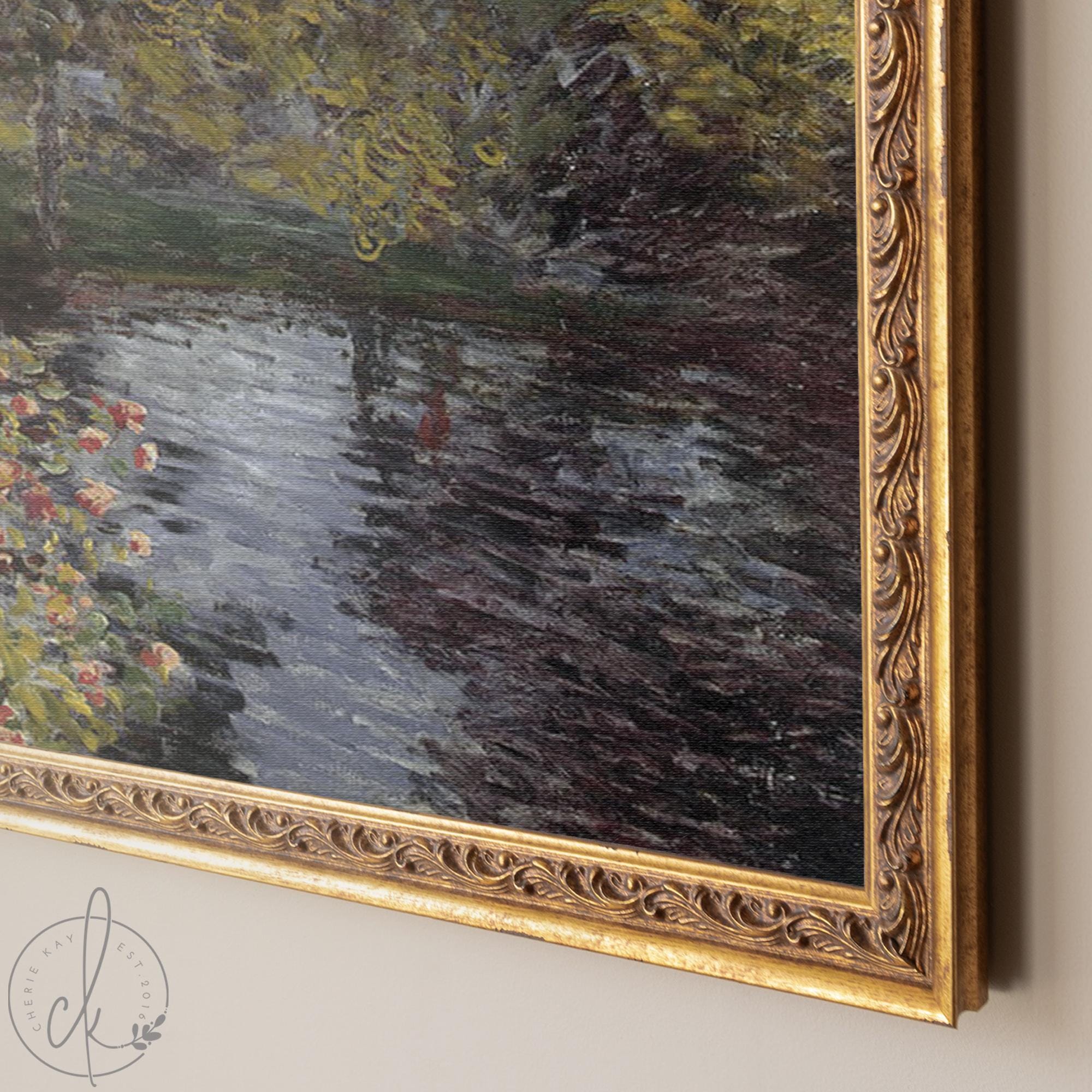 This Monet garden painting is a framed print of Claude Monet's "Corner of the Garden at Montgeron" from 1876 — a flower garden scene with roses, trees, and a pond in deep greens, warm golds, and soft pinks. It comes in an ornate antique-style gold frame, ready to hang, and looks right at home in a living room, dining room, or entryway.