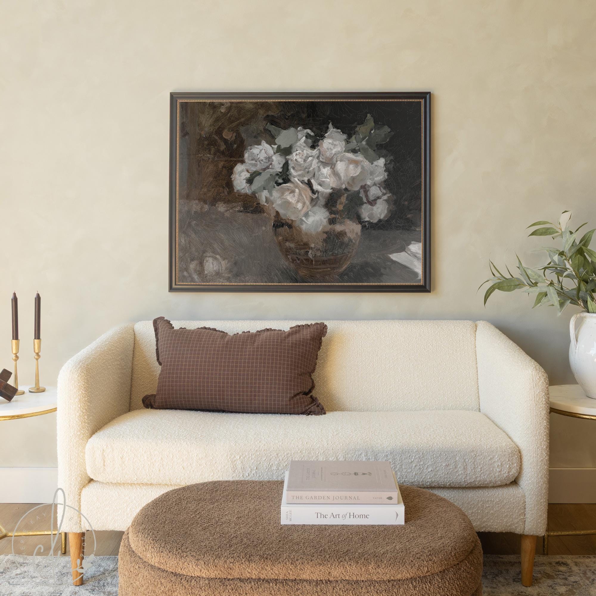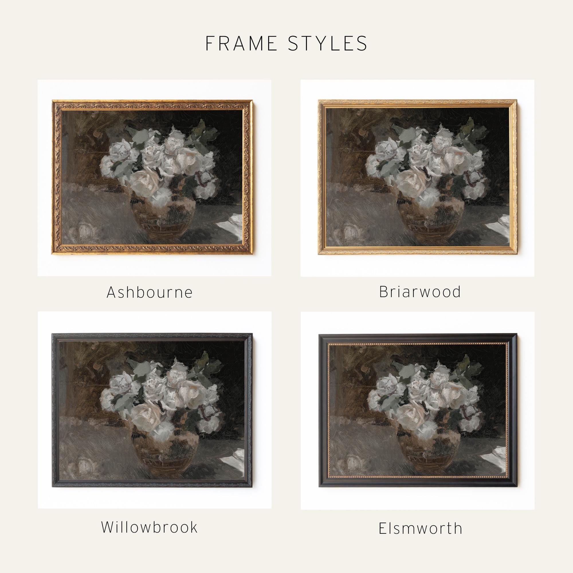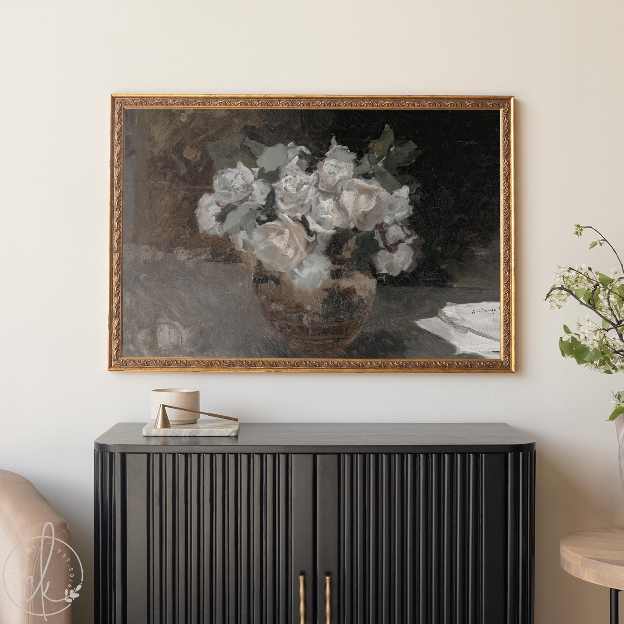 This moody floral painting features a soft bouquet of white roses in a vase, recreated in the style of a classic still life. The deep tones and antique look bring a calm, old-world feeling to your space. Each piece includes a detailed frame that adds a vintage touch and makes it ready to hang in your living room, dining room, or bedroom.