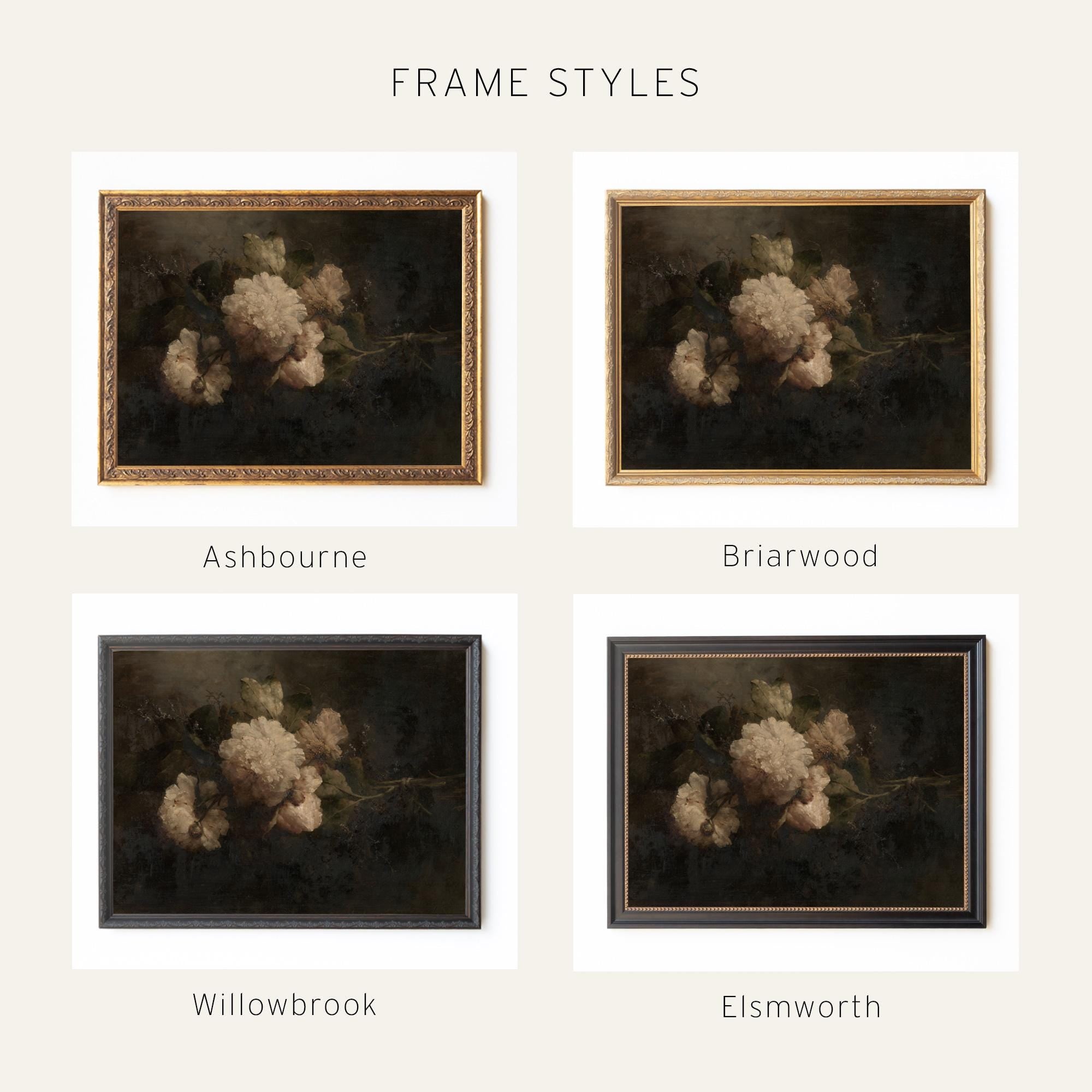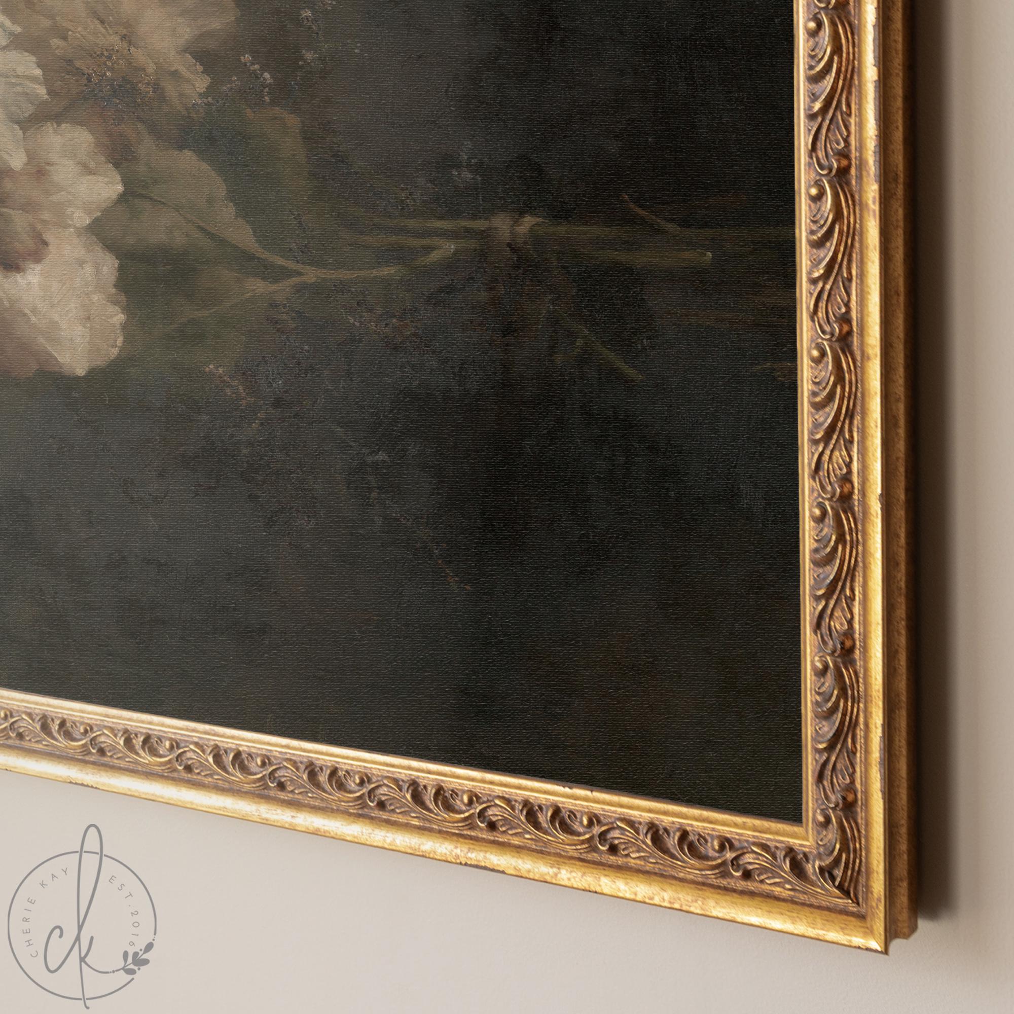 This moody floral wall art shows soft white peonies against a dark background in a gold frame. The vintage flower painting has a classic look that fits well in a living room, bedroom, or entryway. It adds a warm, old style feel to your space and brings simple beauty to your home.