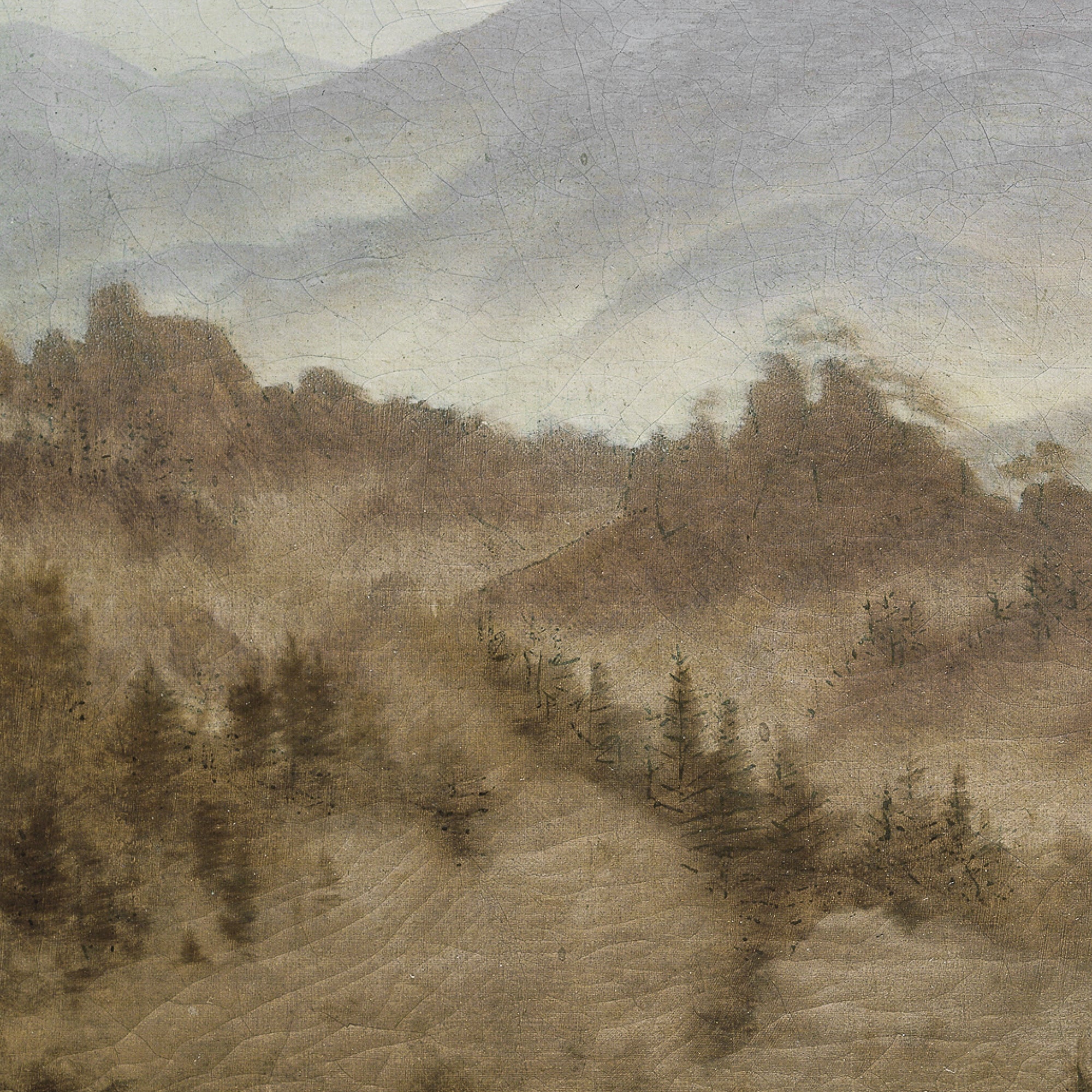This mountain scene painting is a large framed landscape canvas featuring misty peaks, evergreen trees, and soft natural tones. Perfect as large wall art for a living room, bedroom, or entryway, this oversized nature wall decor adds depth and warmth to any space. This framed canvas art piece, it makes an ideal choice for creating a beautiful statement wall above a sofa or mantel.