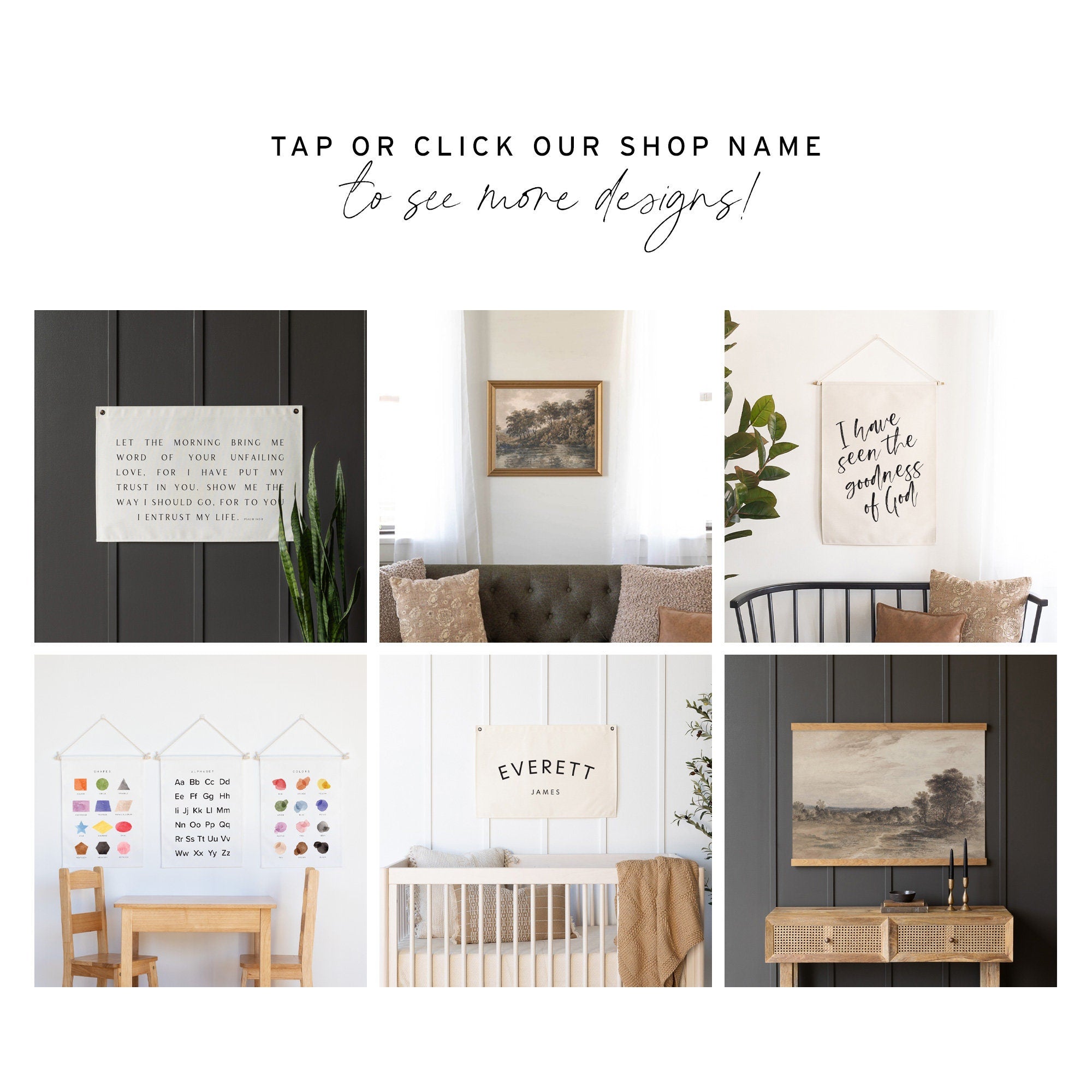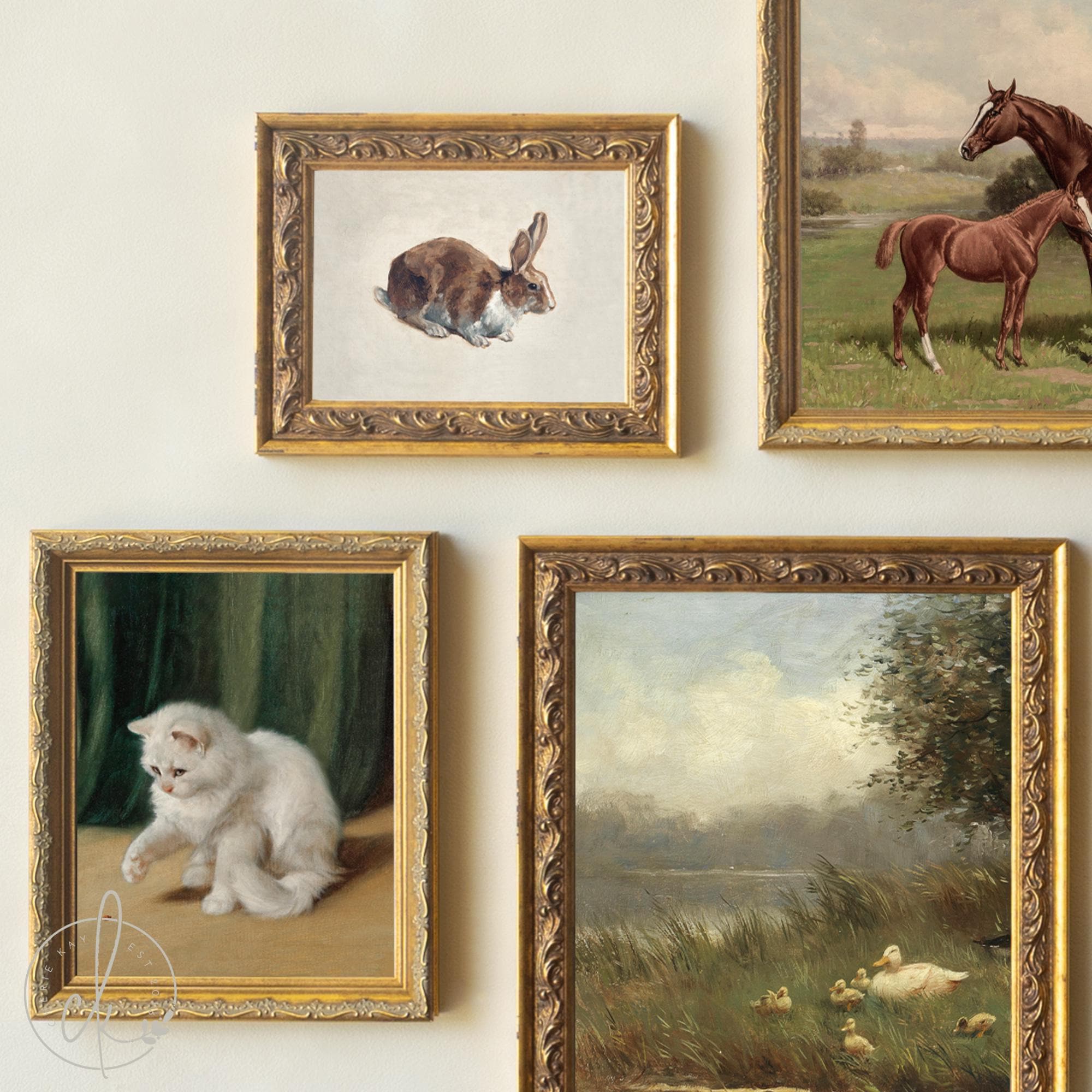 This nursery gallery wall features a curated mix of framed vintage animal prints — including a horse and foal, bunny, kitten, puppies, and a peaceful countryside scene. Each piece has warm neutral tones and ornate frames that create a cozy, nostalgic look perfect for a baby’s room or play space. Together, these vintage animal prints bring gentle color and character to any vintage nursery wall art theme.