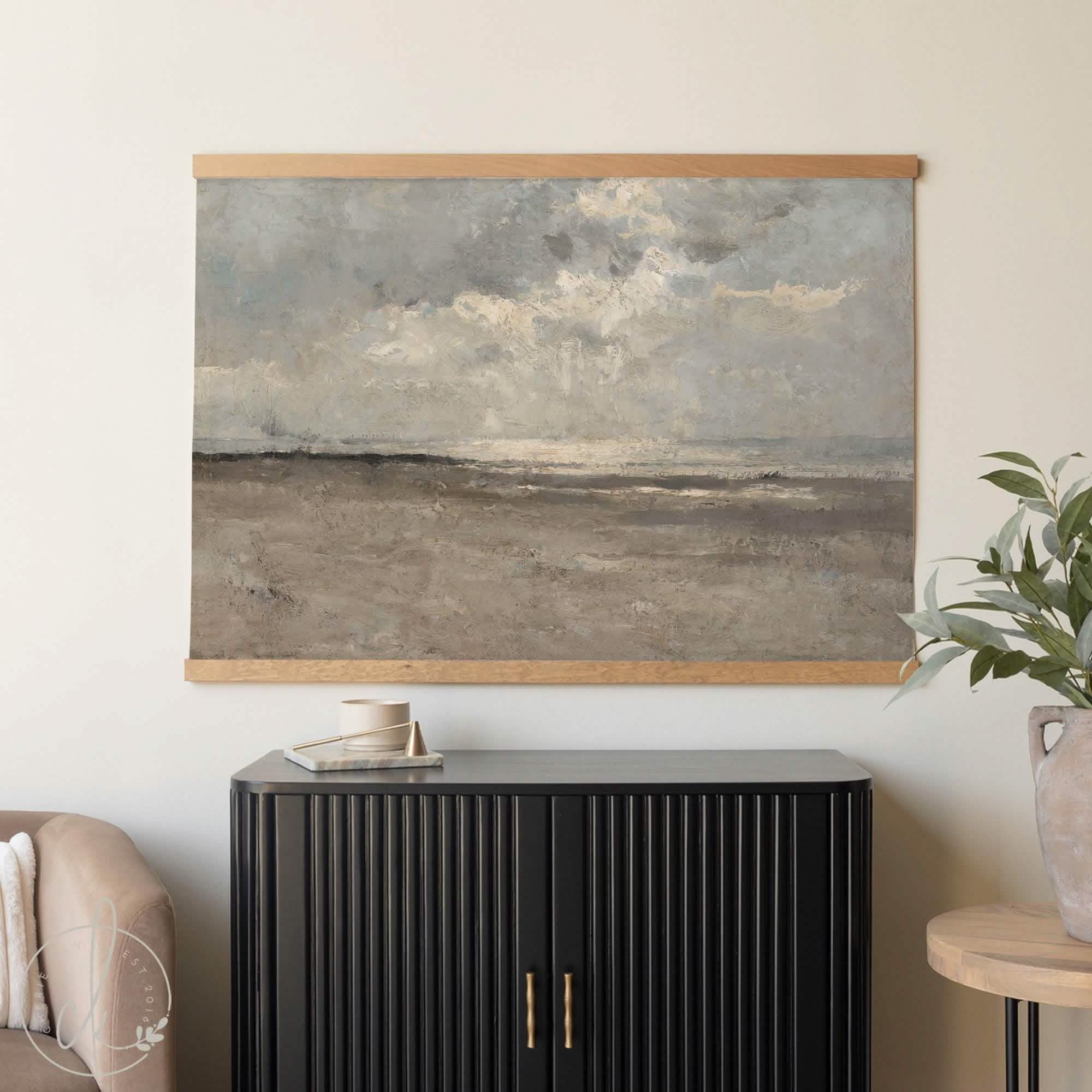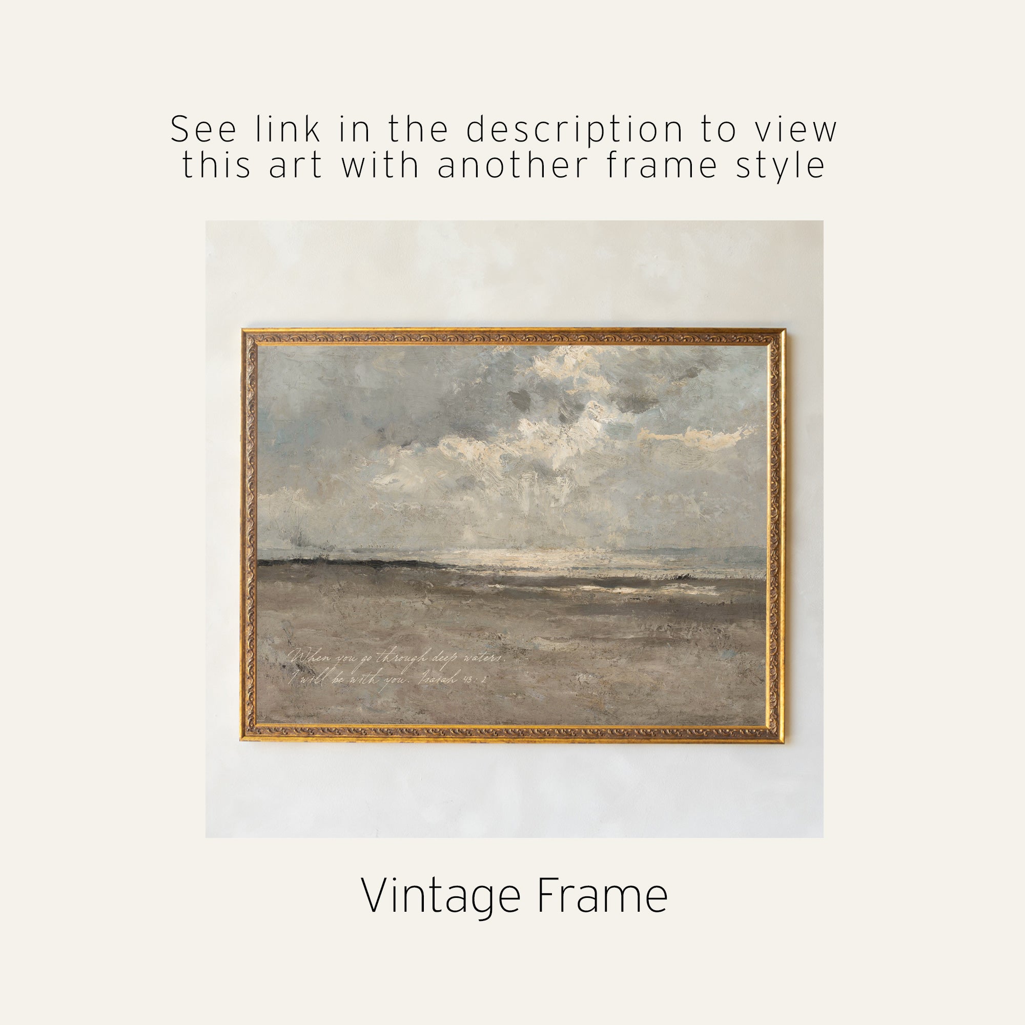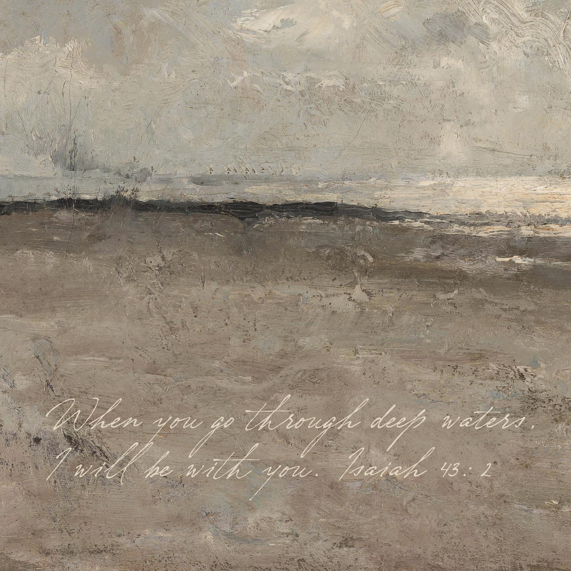 This ocean landscape wall art shows calm waves and soft clouds in gentle neutral tones. The verse on the canvas reads, “When you go through deep waters, I will be with you. Isaiah 43:2.” It’s a large coastal canvas that brings peace and faith into your home. Perfect for your living room, bedroom, or entryway.