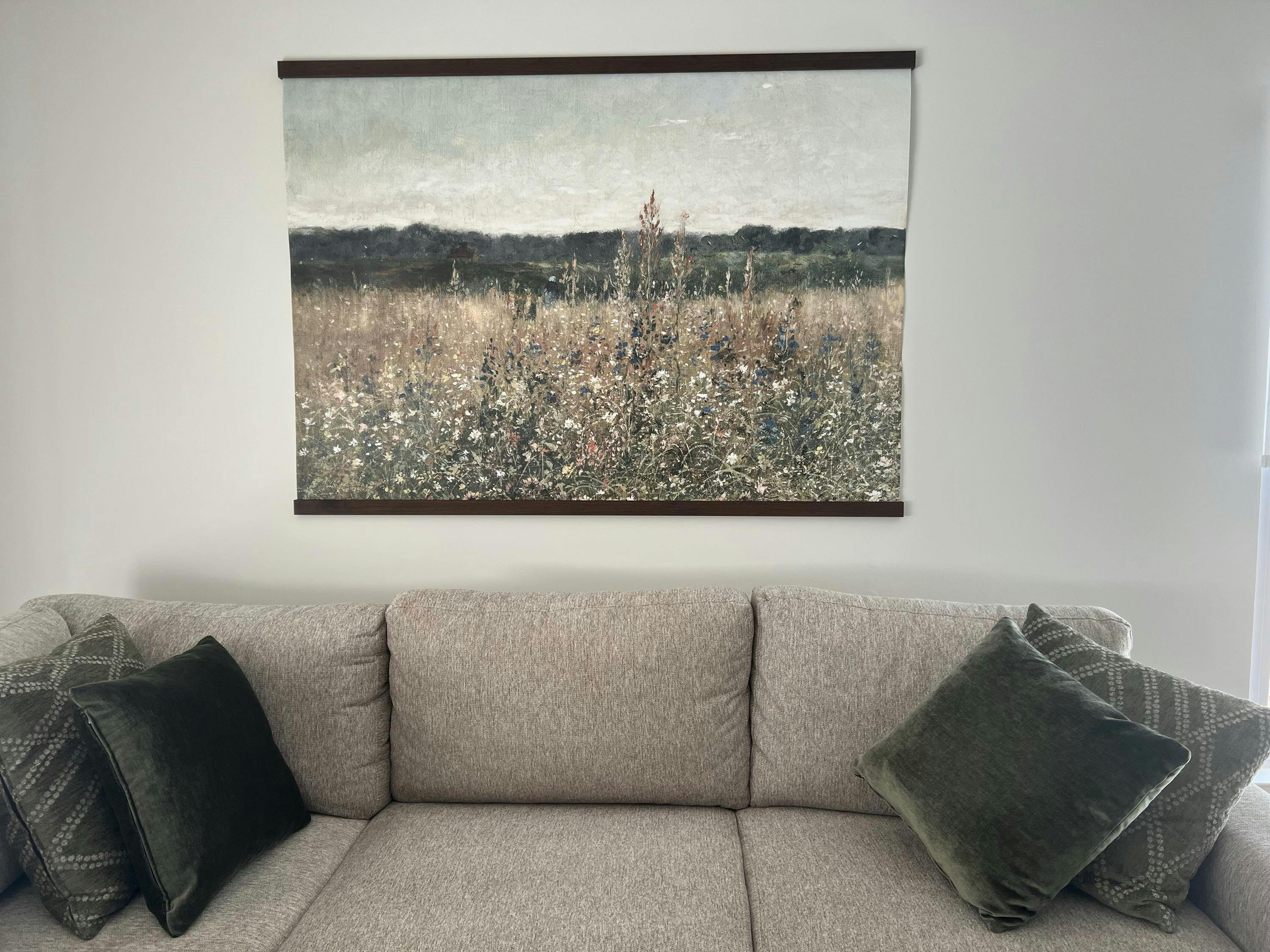 Elevate your home with the beauty of this large canvas tapestry, beautifully depicting a serene wildflower field in soft, neutral tones. Ideal for farmhouse or modern vintage decor, this oversized wall art adds a warm, inviting touch to any living room, bedroom, or entryway. Expertly printed on high-quality canvas and paired with wooden hanging rails, this vintage-inspired tapestry makes a stunning focal point while bringing the calming beauty of nature indoors.