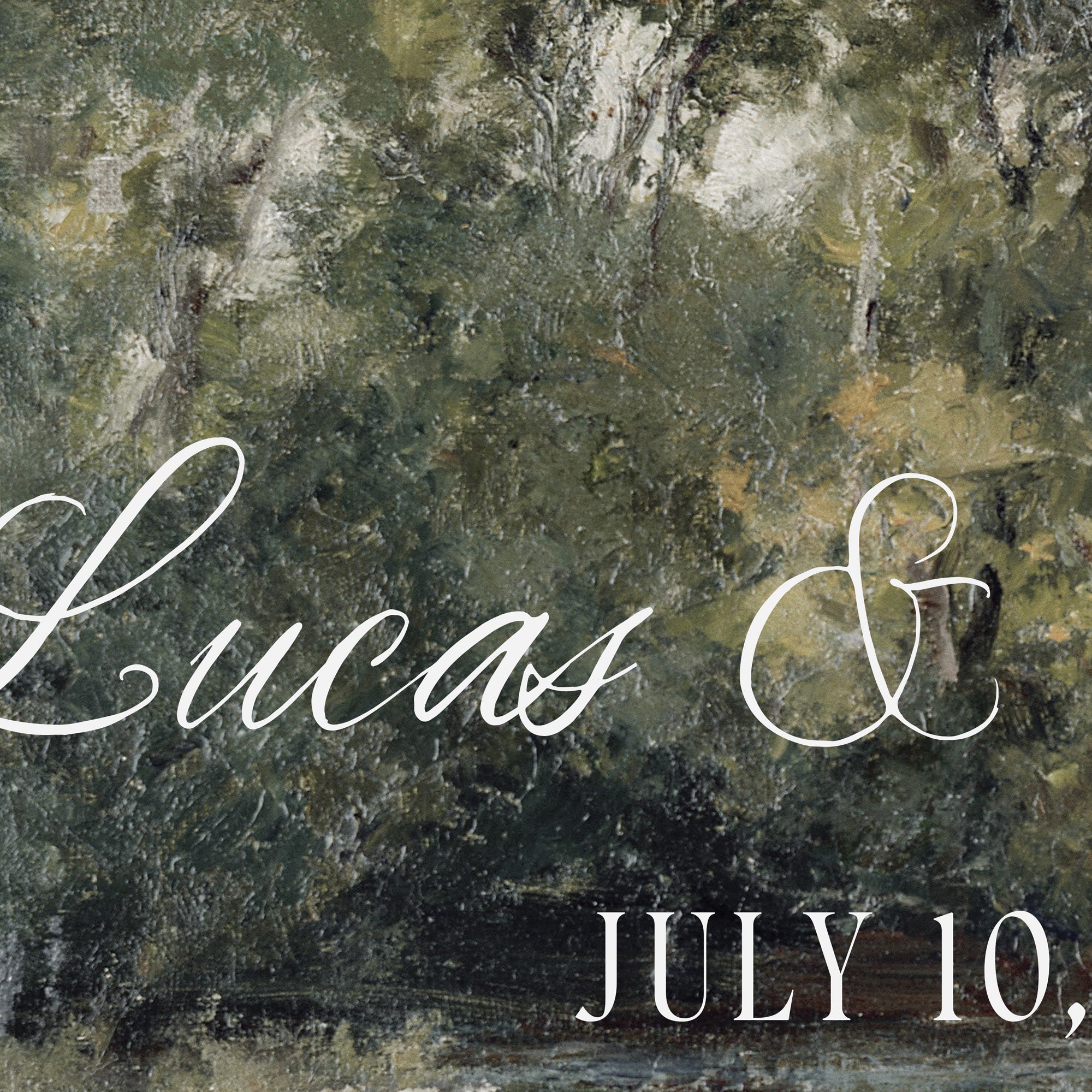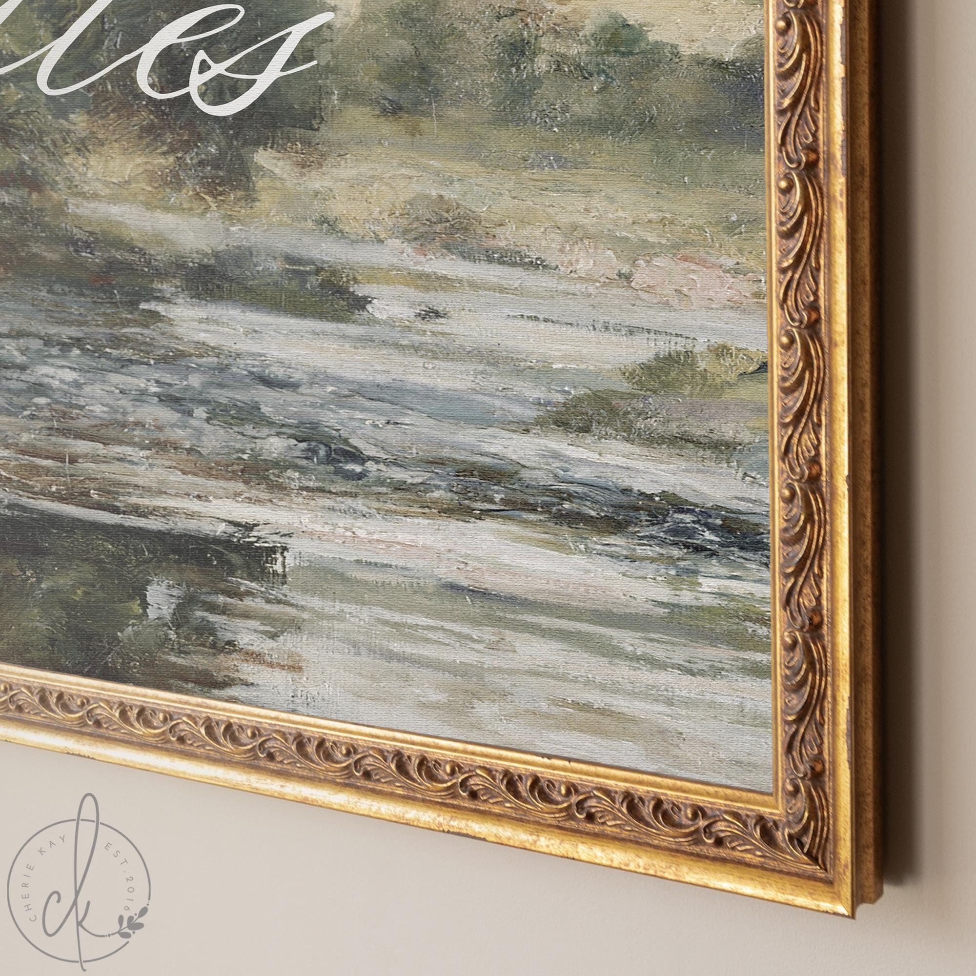 This personalized last name sign layers your family name and date over a vintage landscape canvas — a riverside scene with deep green trees and rolling fields. Finished in an ornate gold frame, it arrives ready to hang. It makes a great wedding gift for a couple, realtor closing gift, or personalized housewarming gift, and hangs beautifully as framed wall art in an entryway or living room.