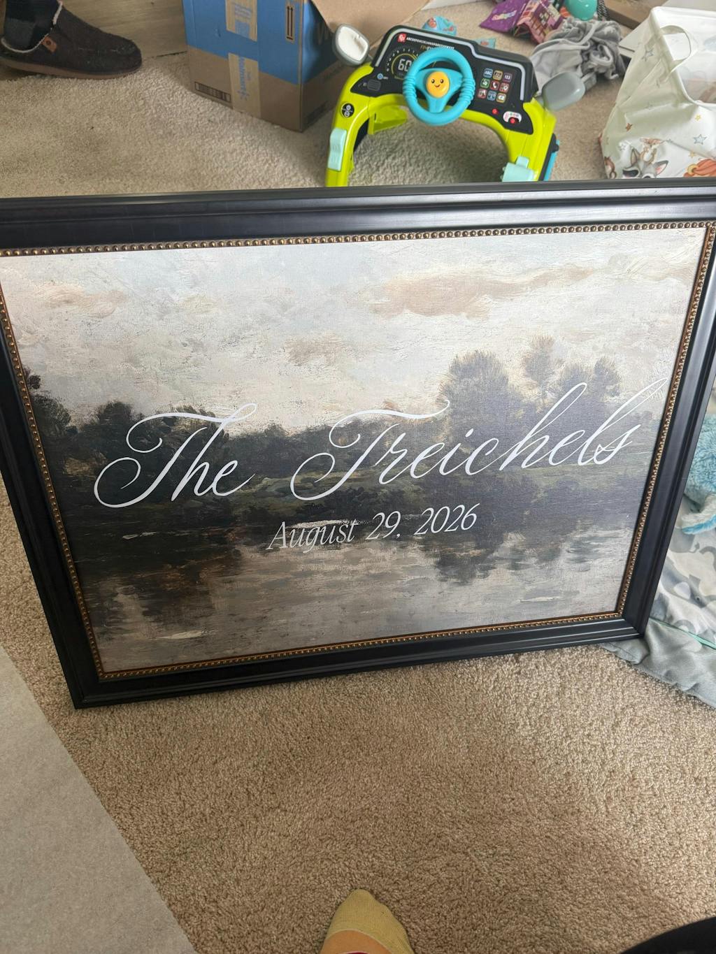 This personalized wedding sign features your names and wedding date over a beautiful landscape scene in a gold frame. It’s perfect for welcoming guests at your ceremony or reception, then later for hanging as custom name date wall art in your home. The artwork’s vintage landscape and warm tones bring natural beauty to your space, making it a lasting keepsake for your special day.