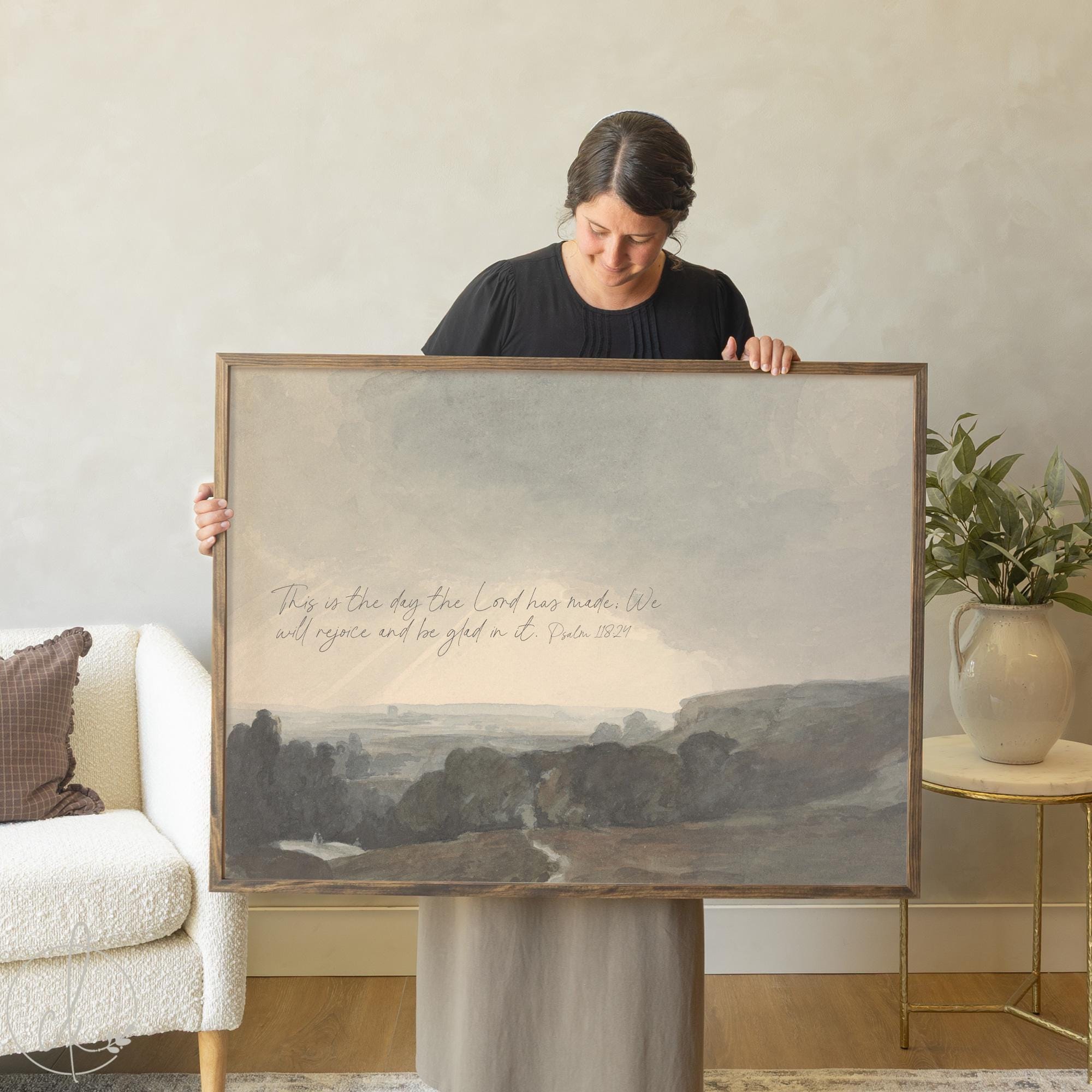 This framed landscape art features the verse, “This is the day the Lord has made; we will rejoice and be glad in it.” — Psalm 118:24 — written across a peaceful countryside scene.