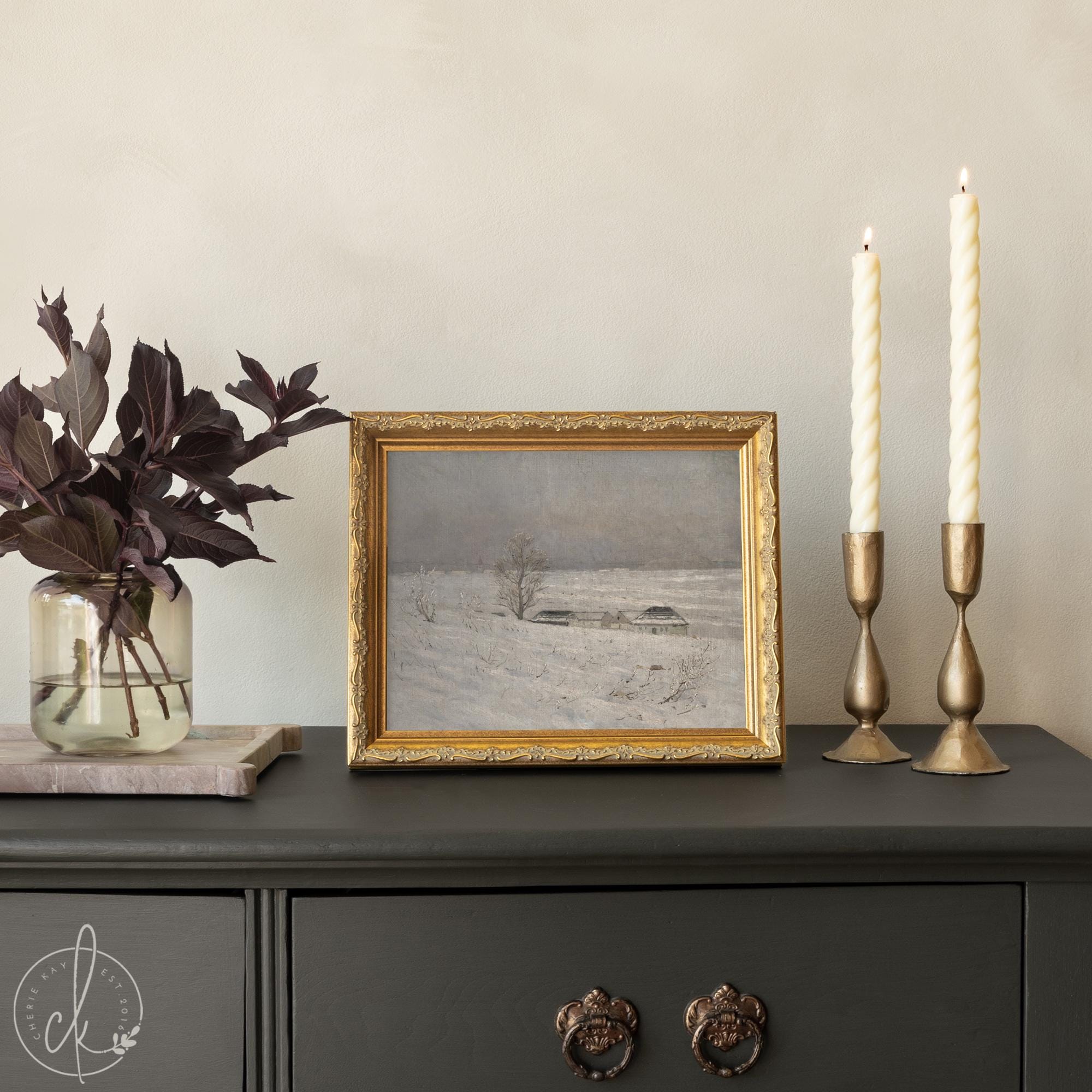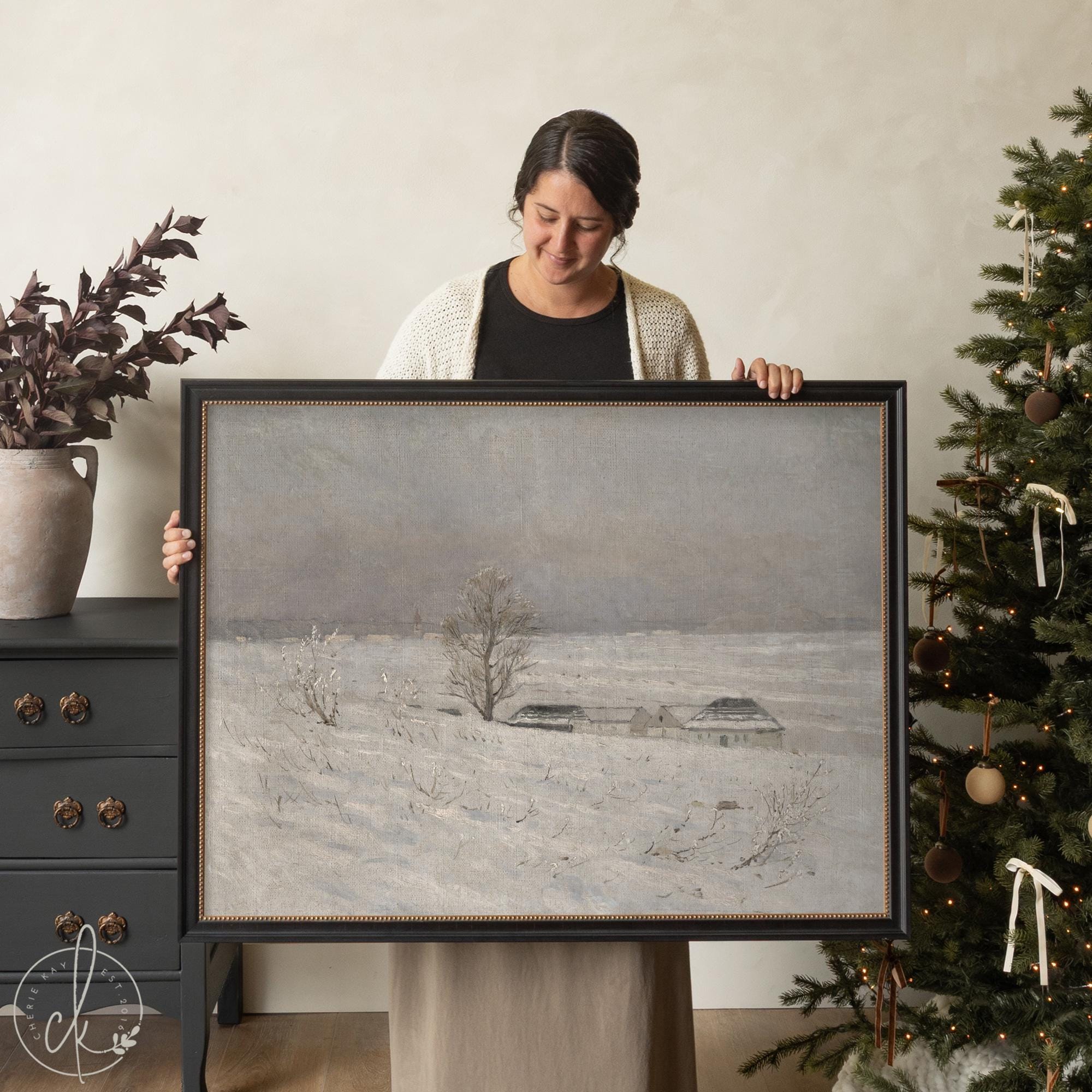 This snowy landscape painting captures the quiet beauty of a winter’s day, featuring soft gray skies, distant farm rooftops, and a single bare tree across a snowy field. Perfect as gold framed winter wall art for your living room or entryway, it complements neutral home decor and seasonal Christmas wall art displays. Its subtle palette pairs beautifully with winter farmhouse decor and adds calm elegance to any large wall art arrangement.