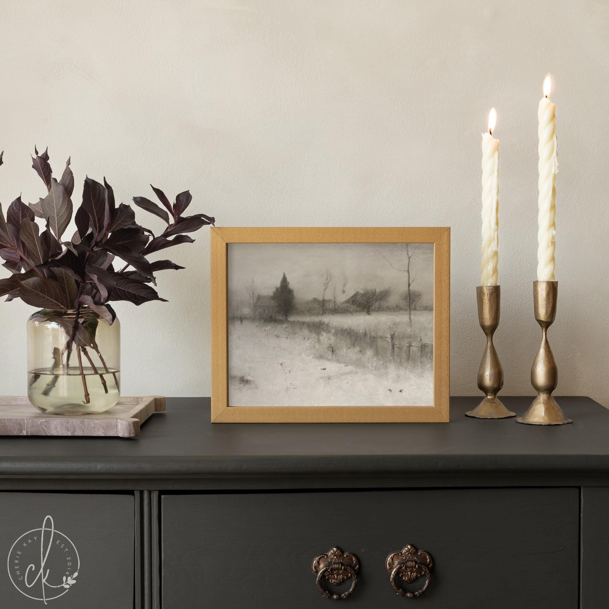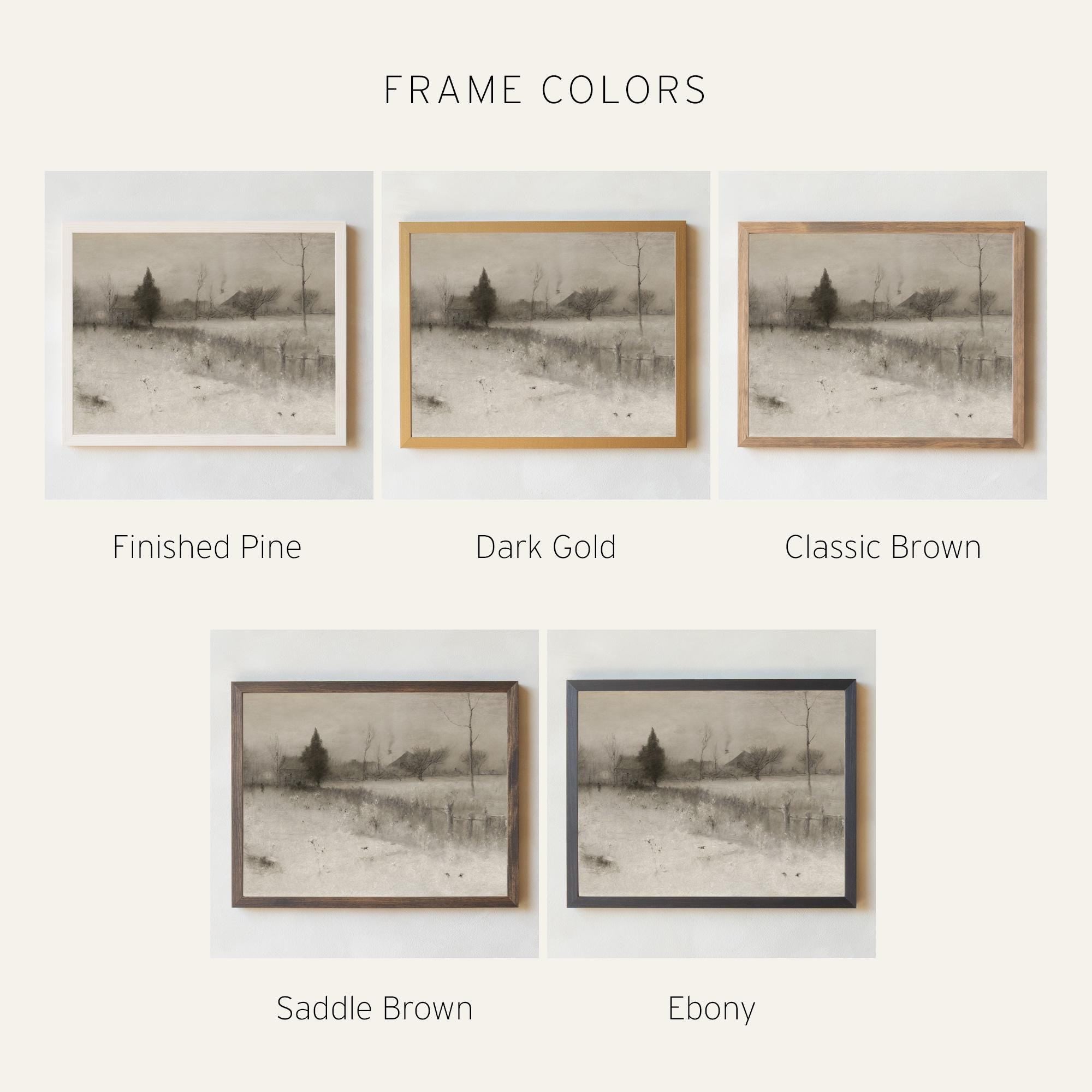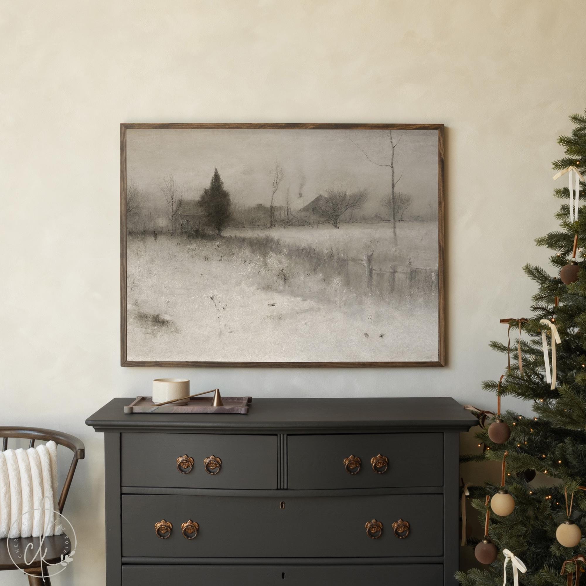 This snowy landscape painting captures a quiet winter scene with bare trees and a farmhouse in the distance, framed in natural wood. Perfect as large wall art for the living room, bedroom, or entryway, its neutral wall art tones and minimalist style make it versatile for any space. This framed winter landscape also works beautifully as nature wall art for anyone who loves seasonal artwork with a calming feel.