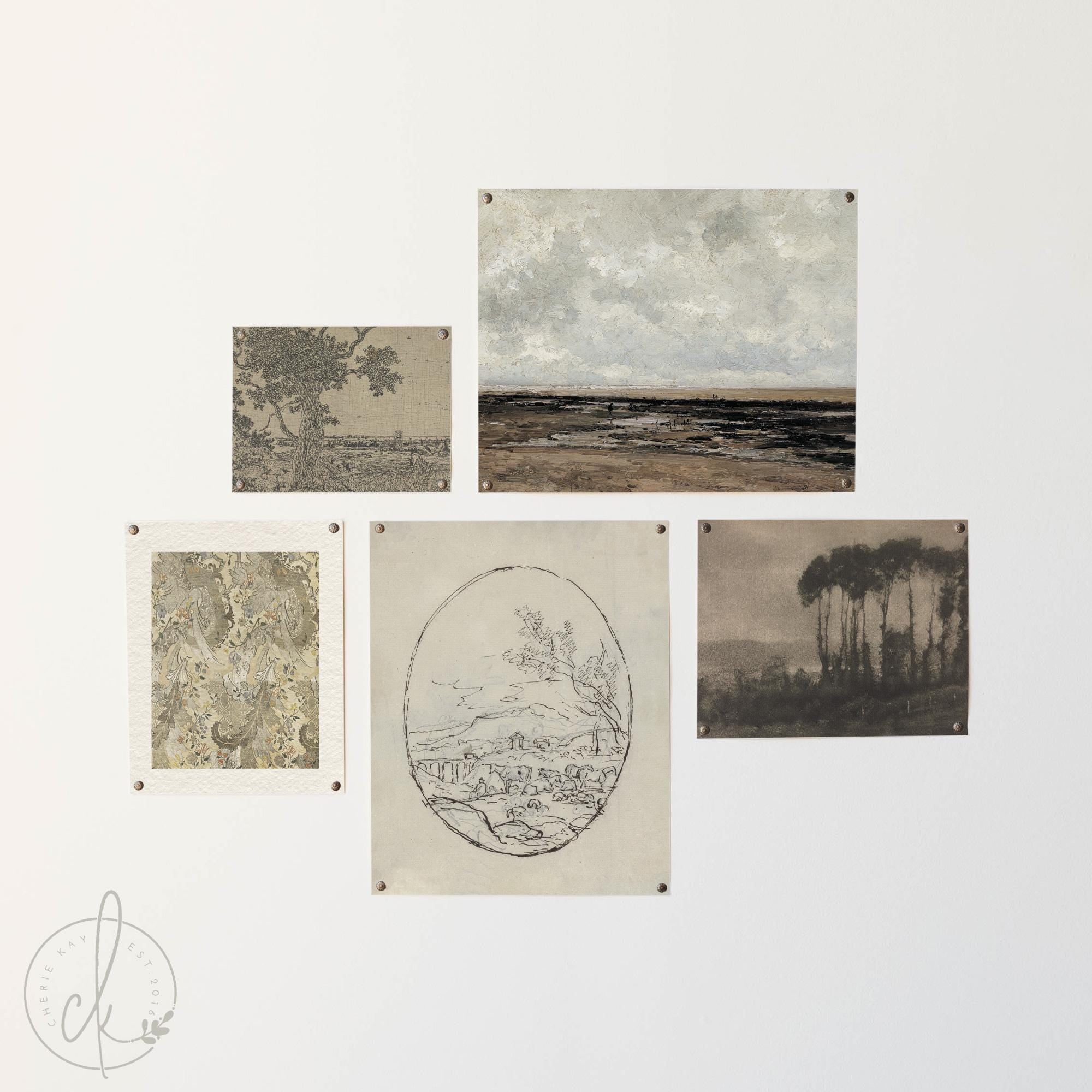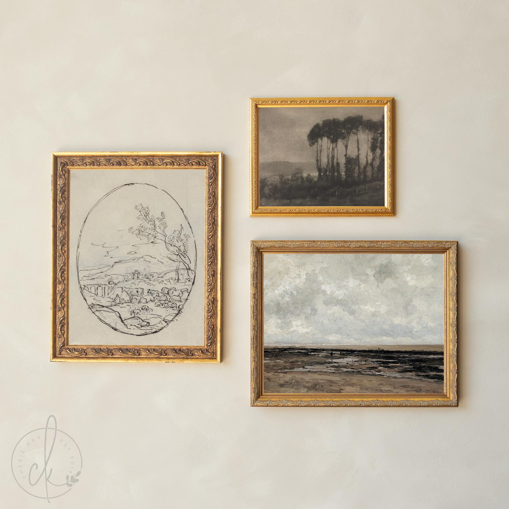 These vintage art prints come framed and ready to hang as a full gallery wall set. Each piece features soft neutral tones, classic landscapes, and antique gold frames that give your space a beautiful vintage look. Perfect for your living room, hallway, or bedroom, this neutral wall decor adds warmth and character while fitting beautifully with many styles of home design.
