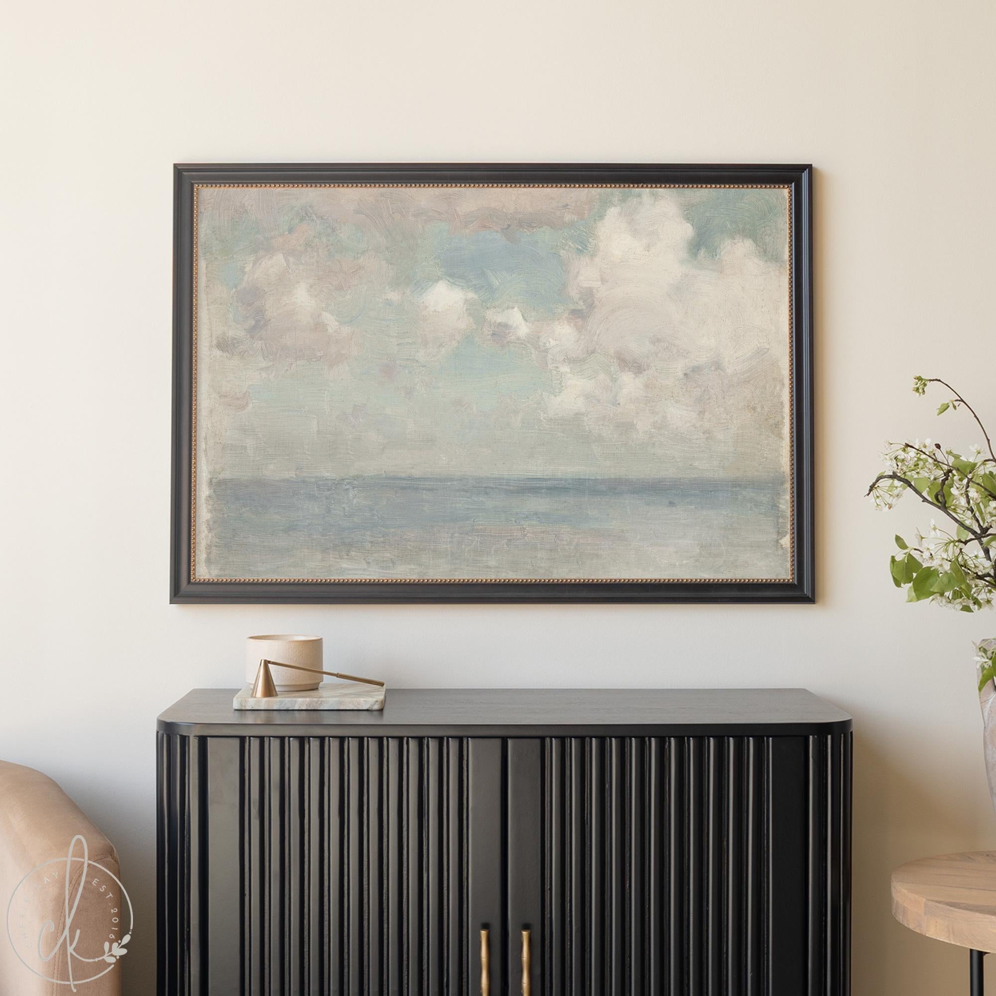 This vintage seascape framed coastal wall art features a soft ocean horizon rendered in muted blues and creams. The ornate gold frame and subtle texture bring warmth and depth, perfect for coastal interiors, bedrooms, or living rooms. Its neutral palette pairs beautifully with natural materials and complements both traditional and modern spaces.