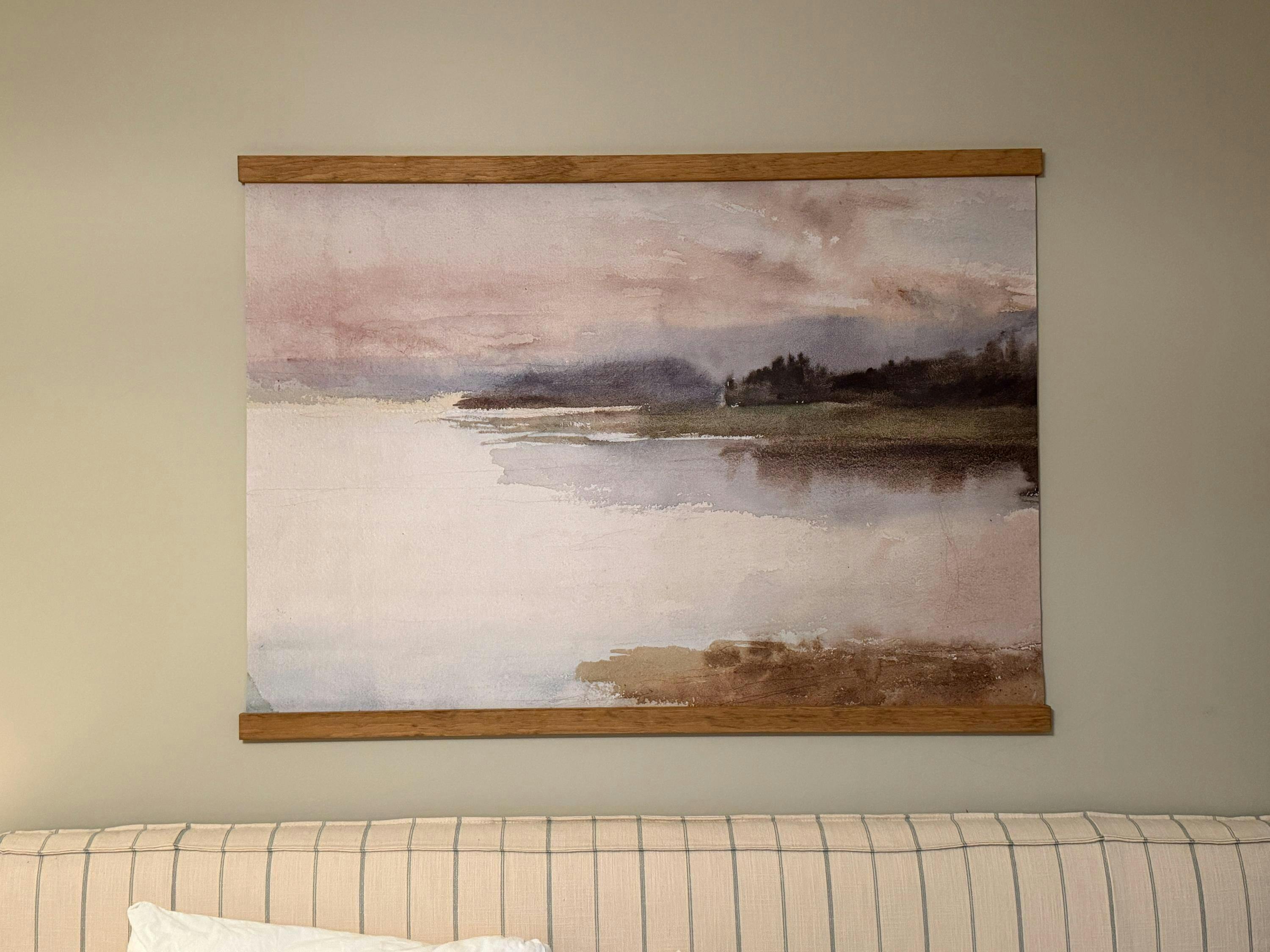 Watercolor landscape painting on an extra-large canvas tapestry delivers a dreamy lake view in soft earth tones, ready to hang and refresh any living room decor.