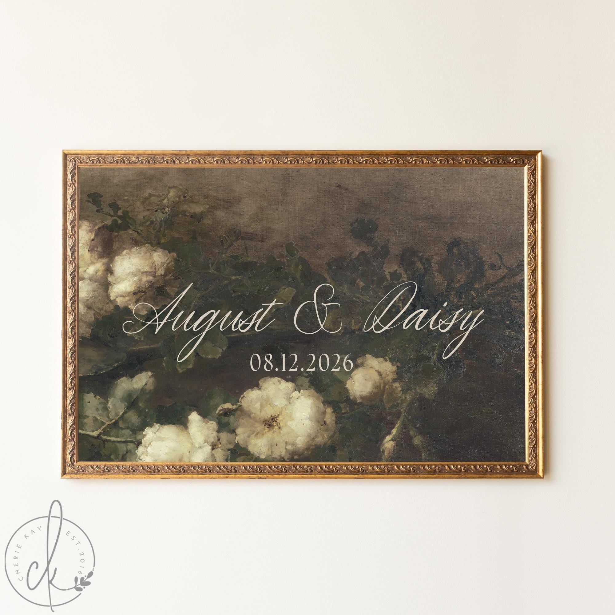 This wedding last name sign features your family name and date in calligraphy script over a moody vintage floral print — white roses against a dark background, all set in an ornate gold frame. It's sized to sit on an easel at your ceremony, reception, rehearsal dinner, or bridal shower, and it looks just as good hung on the wall at home long after the wedding.