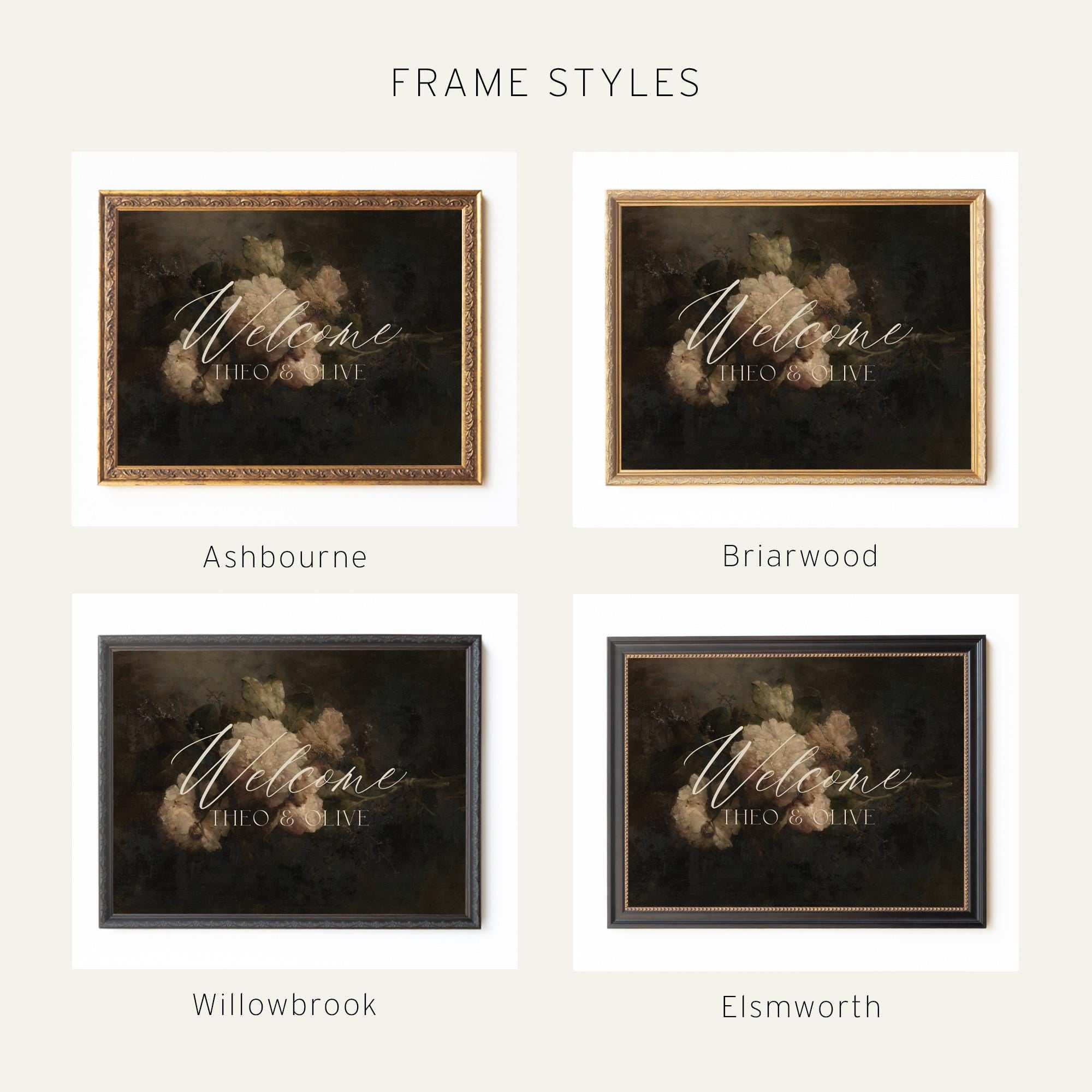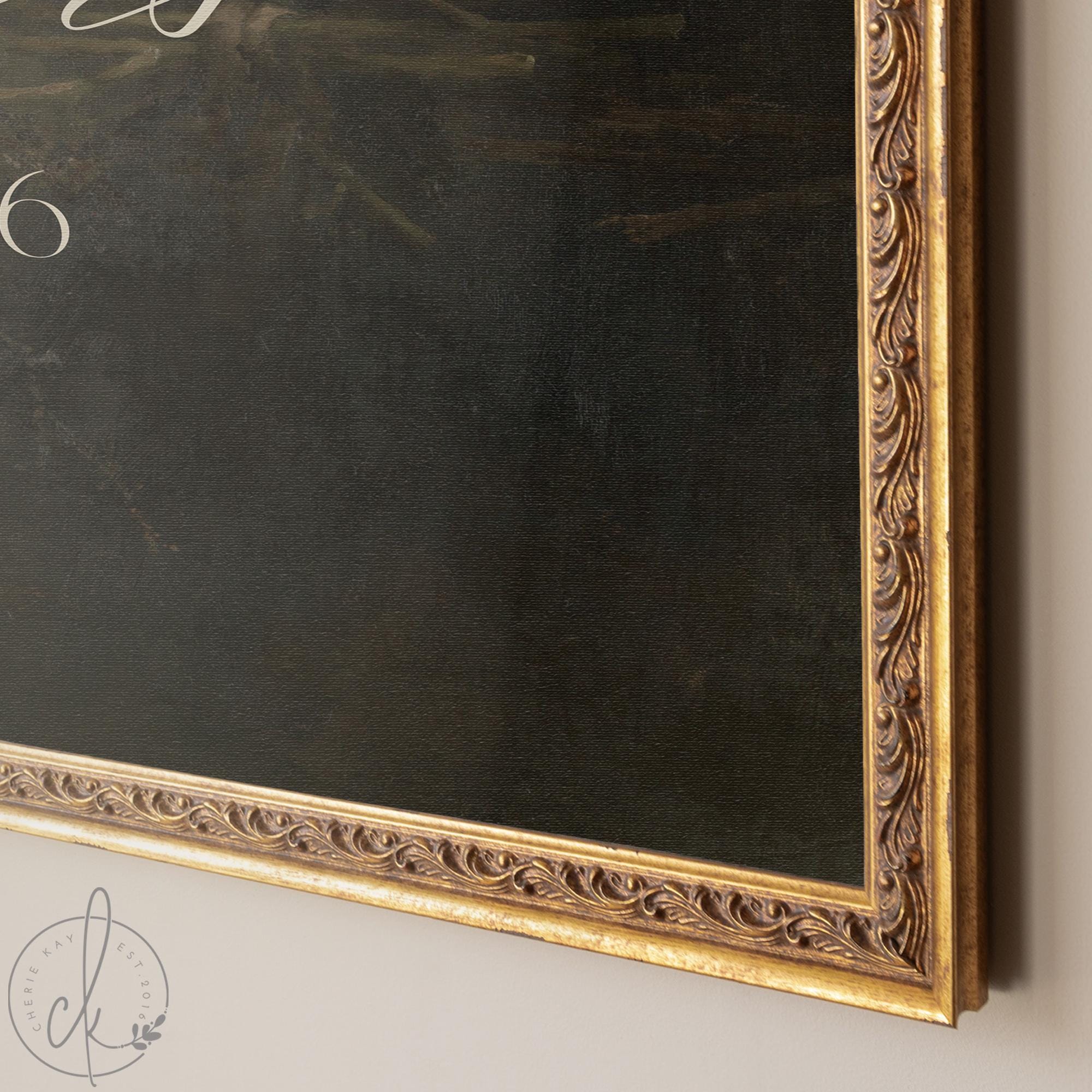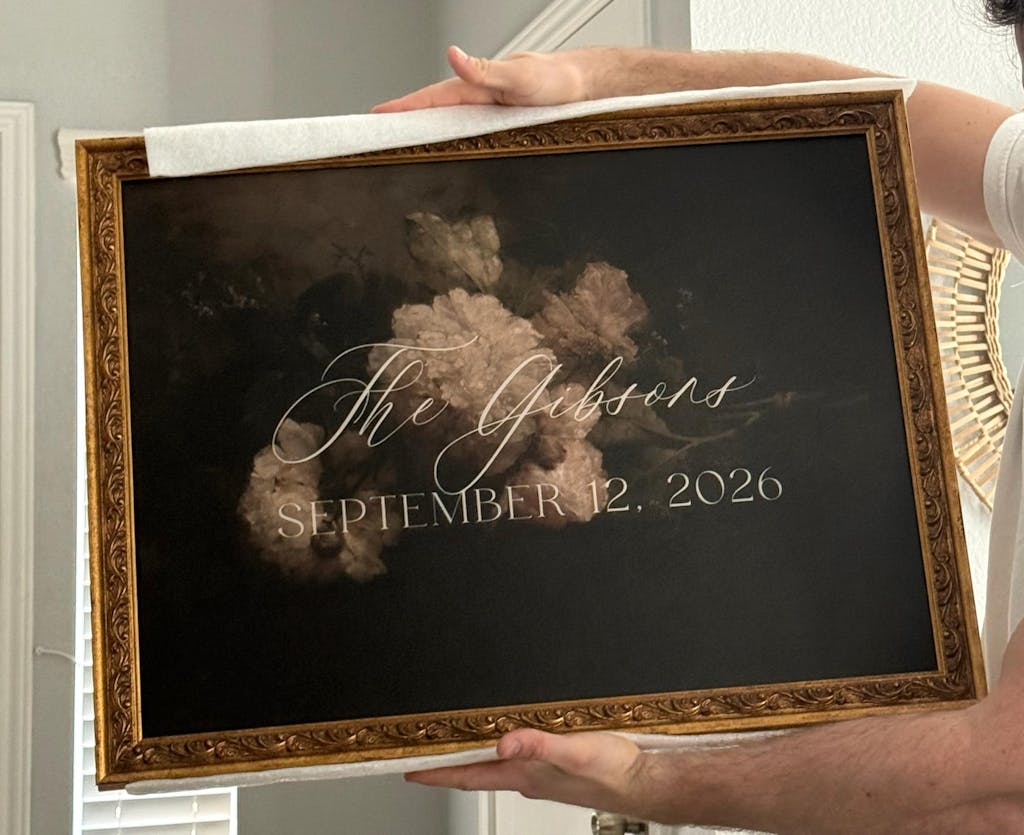 This wedding welcome sign features soft florals and your family name with your wedding date in elegant script. Each piece is a custom name wedding sign, made to celebrate your special day and greet your guests as they arrive. The gold frame and classic floral background create a warm, timeless look that fits beautifully at your ceremony entrance or reception. After the event, it becomes meaningful wedding wall art to display in your home as a keepsake.