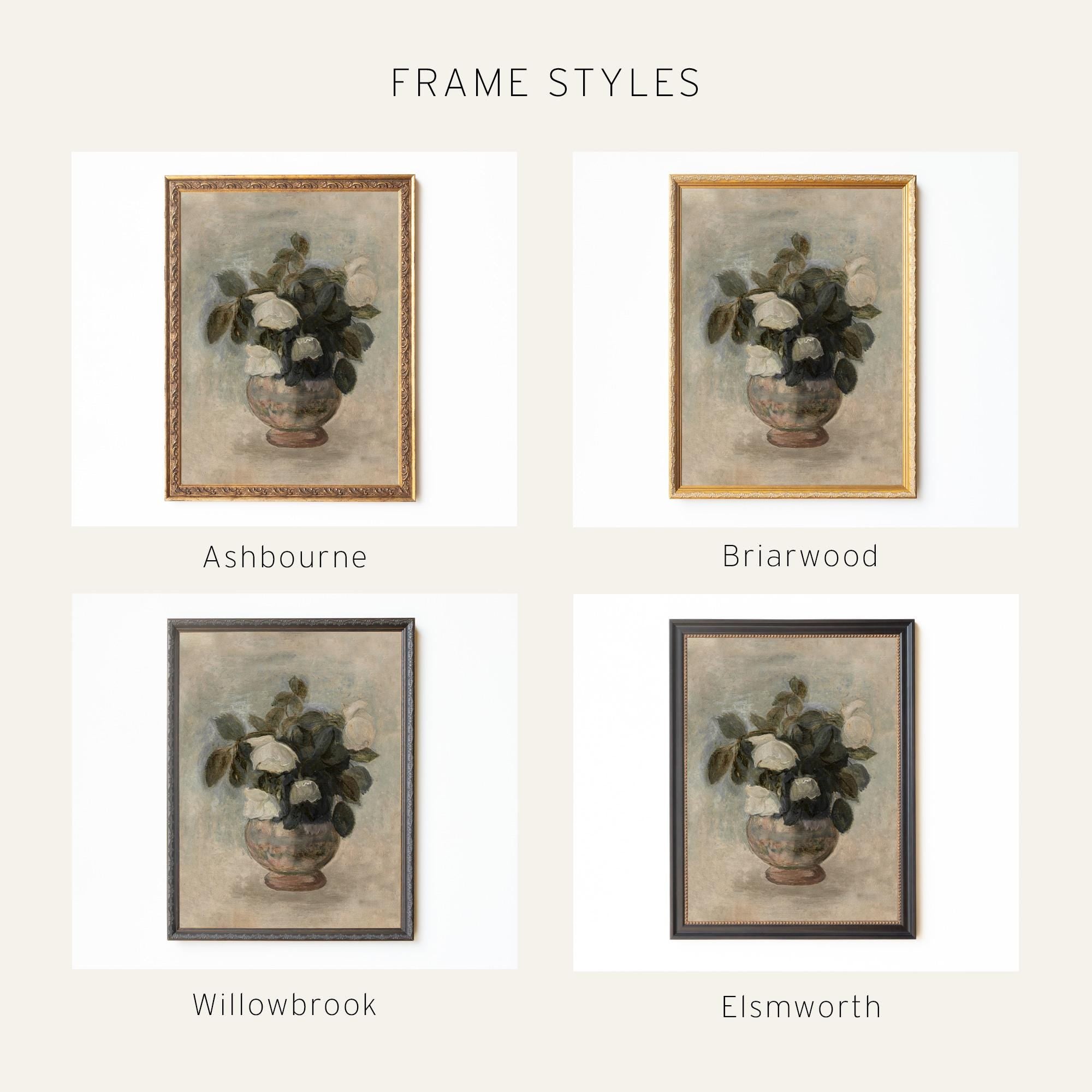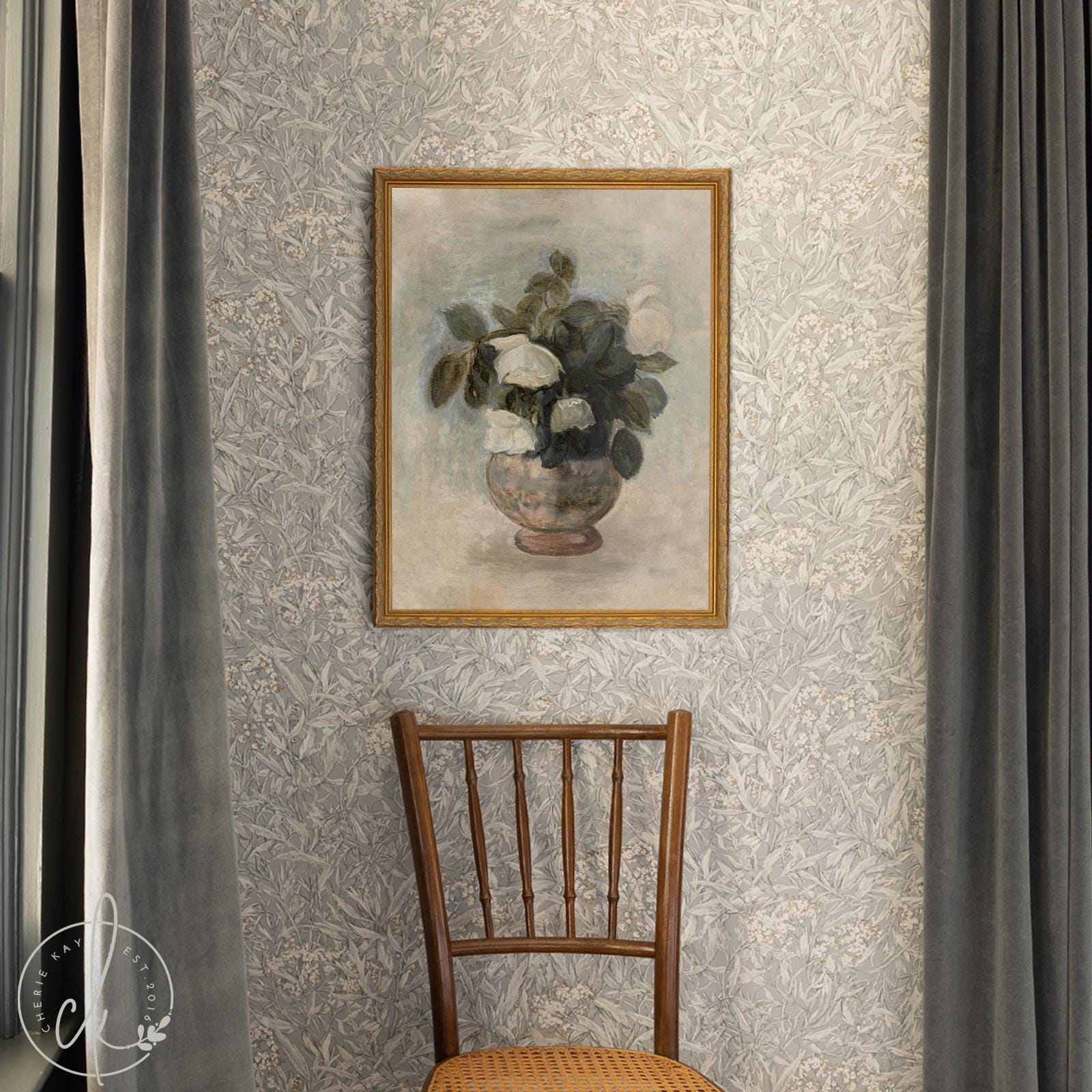 An elegant antique floral painting reproduction featuring a white rose still life in a detailed gold frame. Printed on canvas with rich texture, it’s designed to bring quiet character to your living room wall decor, entryway wall decor, or gallery wall. The floral composition blends effortlessly with vintage flower artwork and botanical wall art themes.