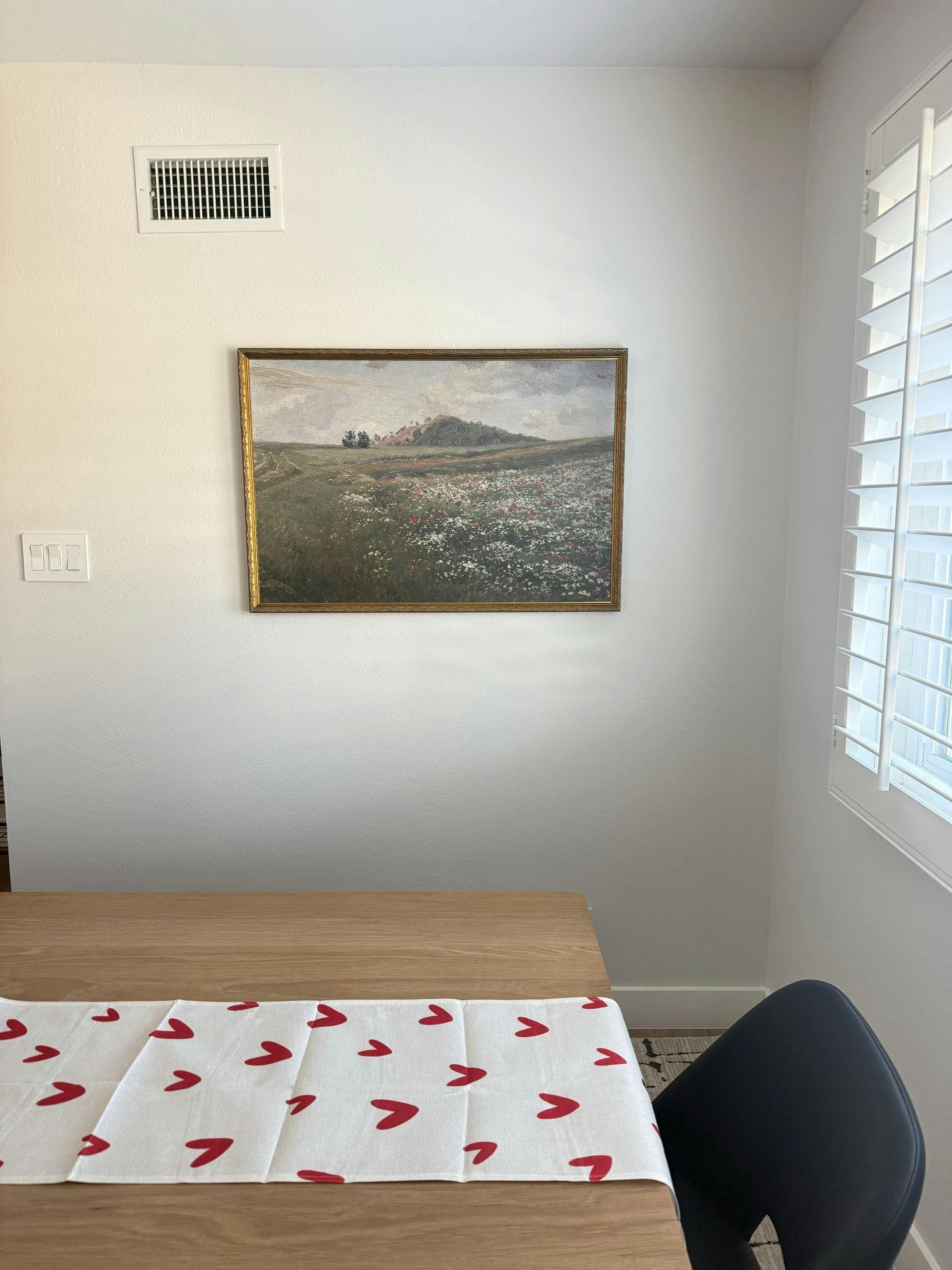Bring the timeless beauty of vintage landscape art into your home with this framed wildflower meadow painting, depicting vibrant red and white blooms across gently rolling hills. Printed on canvas and offered in multiple sizes with custom framing options, it’s ideal as floral wall decor for your living room or any cozy space.