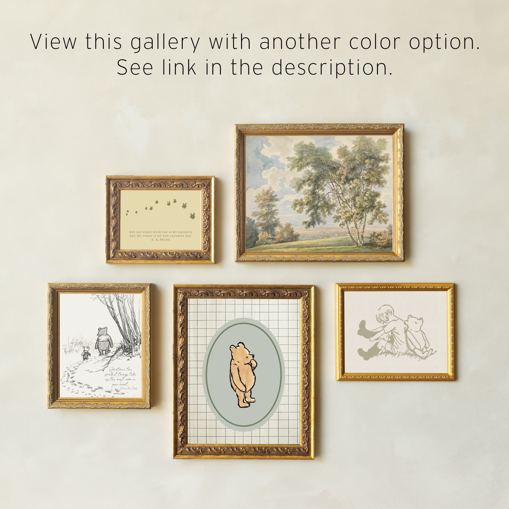 This Winnie the Pooh nursery wall art set features a classic nursery gallery wall with gold frames, storybook-style nursery wall art, and a soft neutral nursery decor palette perfect for a baby girl’s room. The prints include beloved Winnie the Pooh sketches, floral accents, and the sweet quote, “As soon as I saw you, I knew an adventure was going to happen.” Ideal for creating a cozy, timeless baby room wall art display above the crib or changing table.